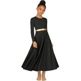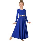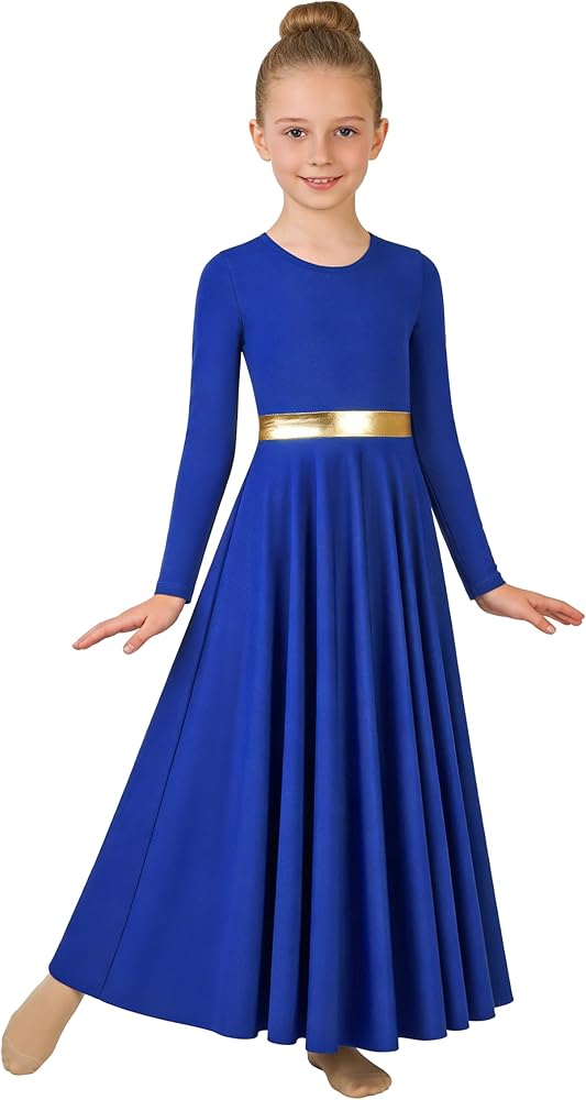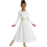 فستان رقص مديح للفتيات: كم طويل مرن، رقبة دائرية، كتلة خصر معدنية، لون ذهبي أبيض ثنائي اللون، ناعم وصديق للبشرة، ملابس بسيطة وجميلة.