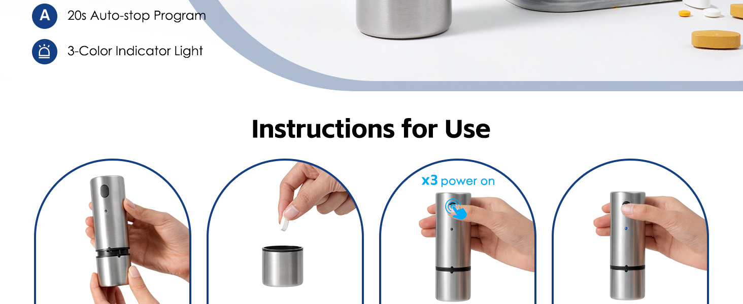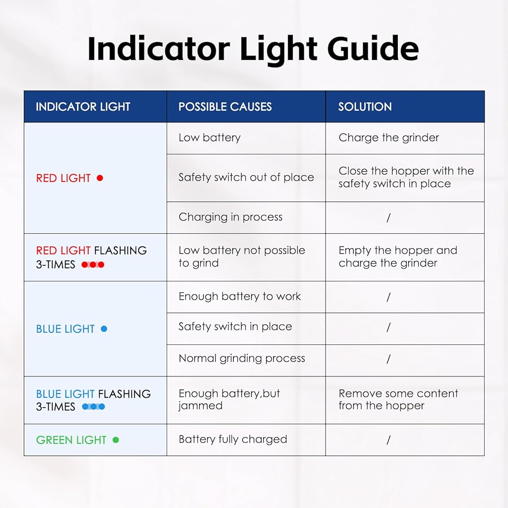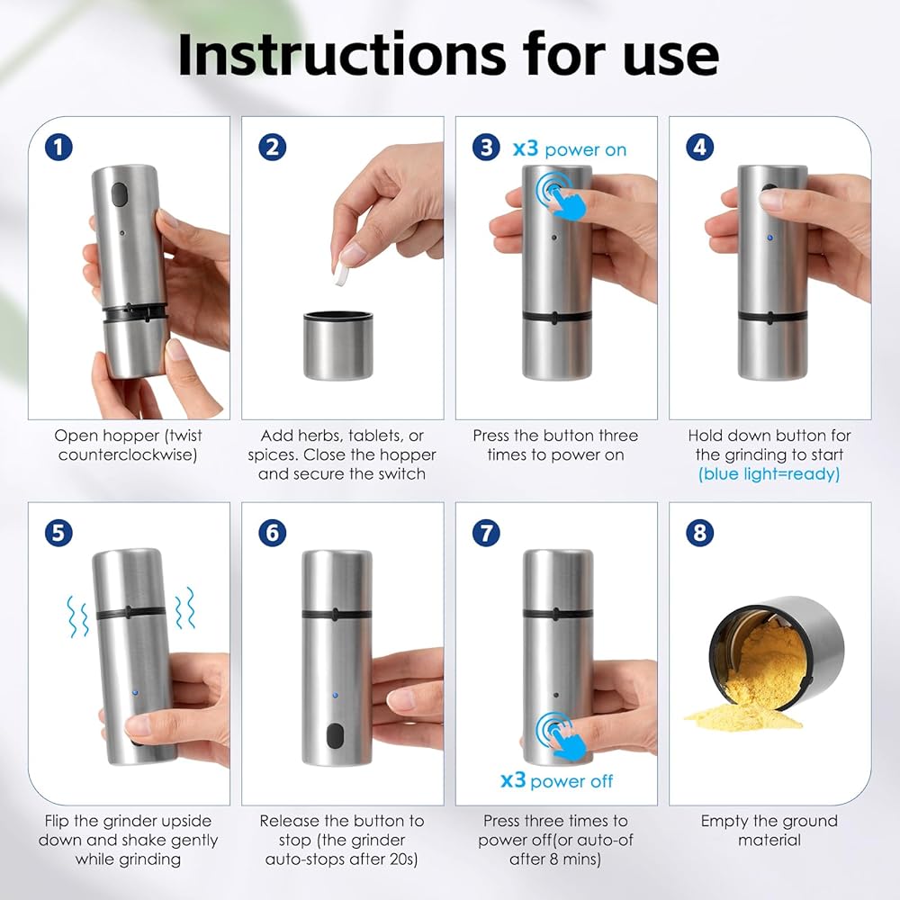 • تعليمات الاستخدام - قم بإضافة الأجهزة اللوحية، وأغلق القابس وقم بتثبيت المفتاح. اضغط على الزر ثلاث مرات لتشغيله. سيكون الضوء أزرق. اضغط باستمرار على الزر لبدء الطحن، واقلب المطحنة رأسًا على عقب وقم بهزها بلطف أثناء الطحن. (للحصول على تعليمات تشغيل أكثر تفصيلاً وتعليمات ضوء المؤشر، يرجى الرجوع إلى الدليل.)