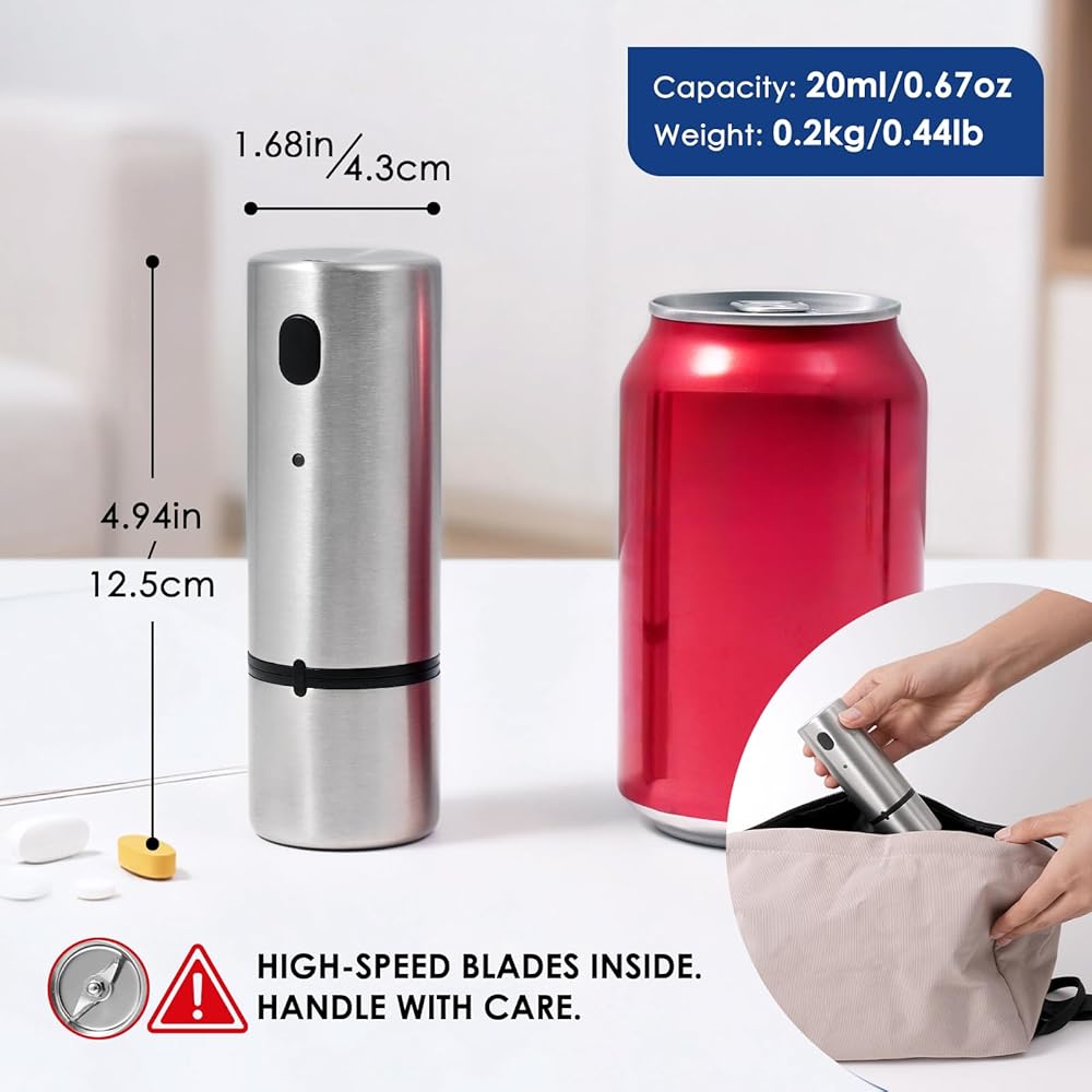 • صغير الحجم ومحمول - خفيف الوزن وصغير الحجم لسهولة التخزين والسفر، مثالي للاستخدام في المنزل أو أثناء التنقل. توفر الشحنة الواحدة أكثر من 40 استخدامًا، مما يجعل مطحنة الأقراص المدمجة هذه رفيقك المثالي.
