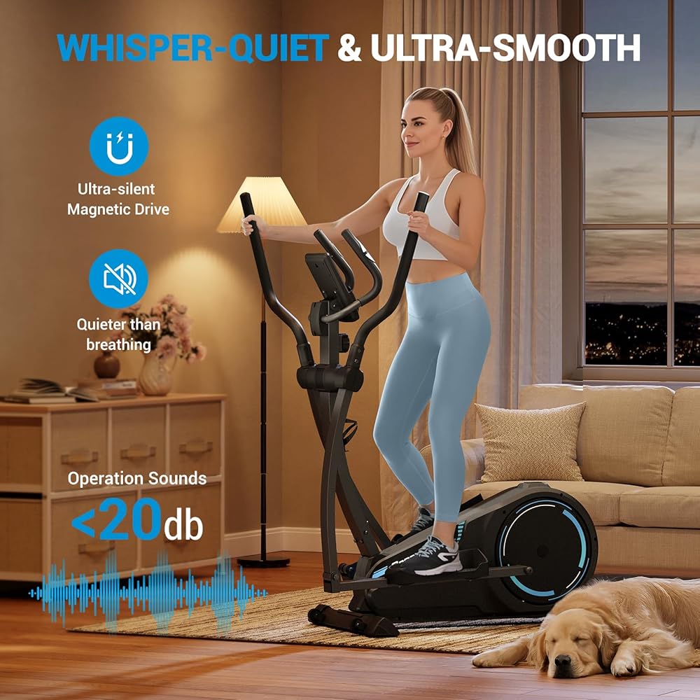 【Whisper-Quiet Magnetic Precision】Revolutionize home fitness with our rear-drive magnetic system, operating below 20dB for silent 24/7 workouts. THERUN Elliptical machine for home is paired with a 17.6lb precision-balanced flywheel, experience buttery-smooth transitions that reduce joint strain while maintaining momentum consistency—perfect for apartment living or late-night exercise routines