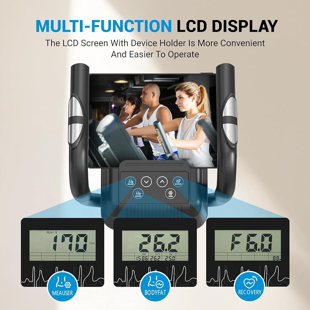 【Smart Fitness Tracking】The 5.5" smart LCD monitor tracks your progress in real-time, including SCAN, TIME, DISTANCE, CALORIES, SPEED, PULSE/RPM, and more. Besides, it can not only display TEMP, CLOCK, and set ALARM CLOCK, but also measure your B.M.R(Basal Metabolic Rate), BODYFAT, and B.M.I(Body Mass Index) by setting your gender, height, weight, and age