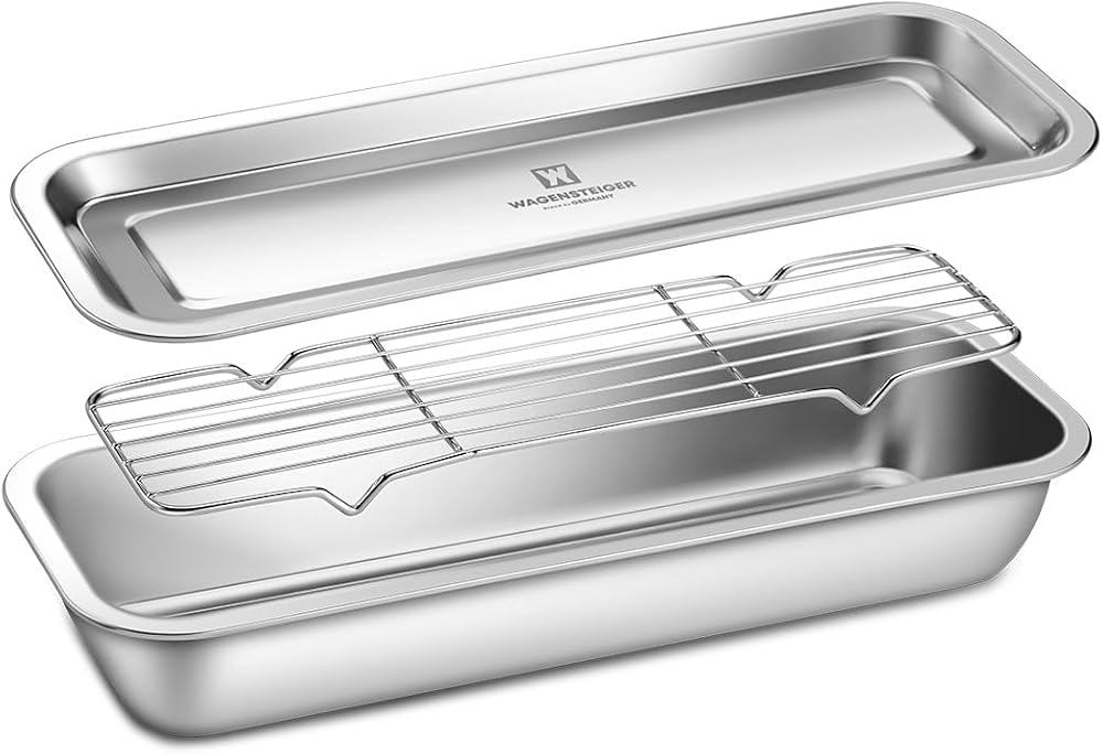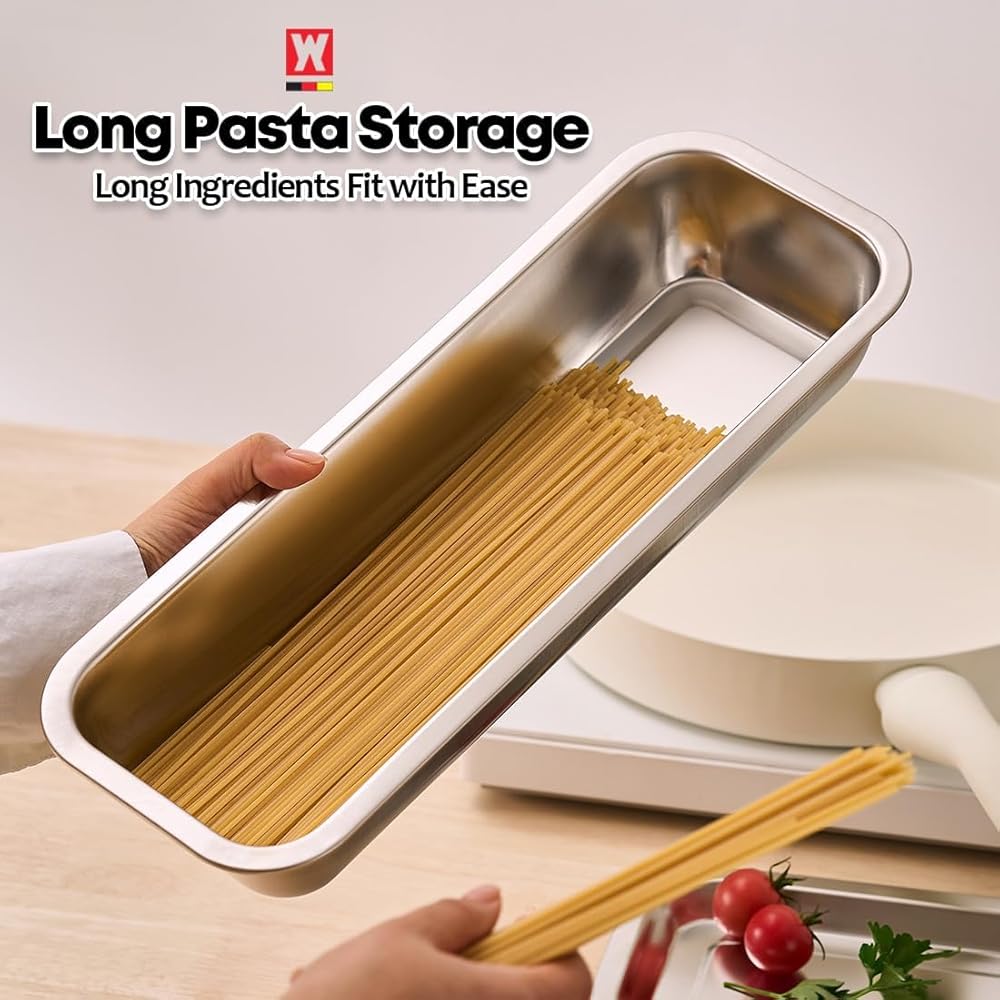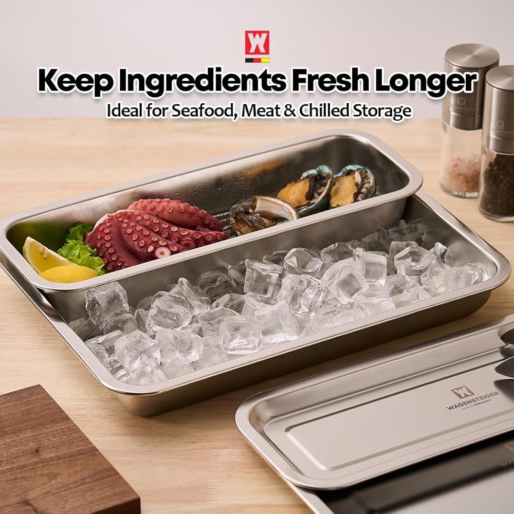 Upgrade your kitchen organization with the WAGENSTEIGER Stainless Steel Prep & Storage Pan, made from premium SUS304 food-grade stainless steel for durability, hygiene, and long-lasting performance. This deep rectangular pan provides a smooth, non-reactive surface that keeps food fresh without absorbing odors—ideal for vegetables, meats, noodles, sauces, utensils, and more. Its deep, space-saving design fits neatly in drawers, cabinets, and refrigerators, and stacks securely with other pans. Pair it with a stainless-steel lid for clean, dust-free storage. Perfect for meal prep, marinating, ingredient storage, freezing, baking, roasting, or serving, it also works as a sushi/kimbap ingredient tray, BBQ prep pan, buffet tray, or stainless drawer organizer. Built to handle both high heat and freezing temperatures, the pan is oven-safe, freezer-safe, and dishwasher-safe for effortless cooking and cleanup. The seamless interior prevents residue buildup and washes easily. Whether for home kitchens or professional restaurants, this versatile stainless steel pan offers reliable performance, cleaner storage, and efficient organization—making it a must-have tool for daily cooking and prep work.