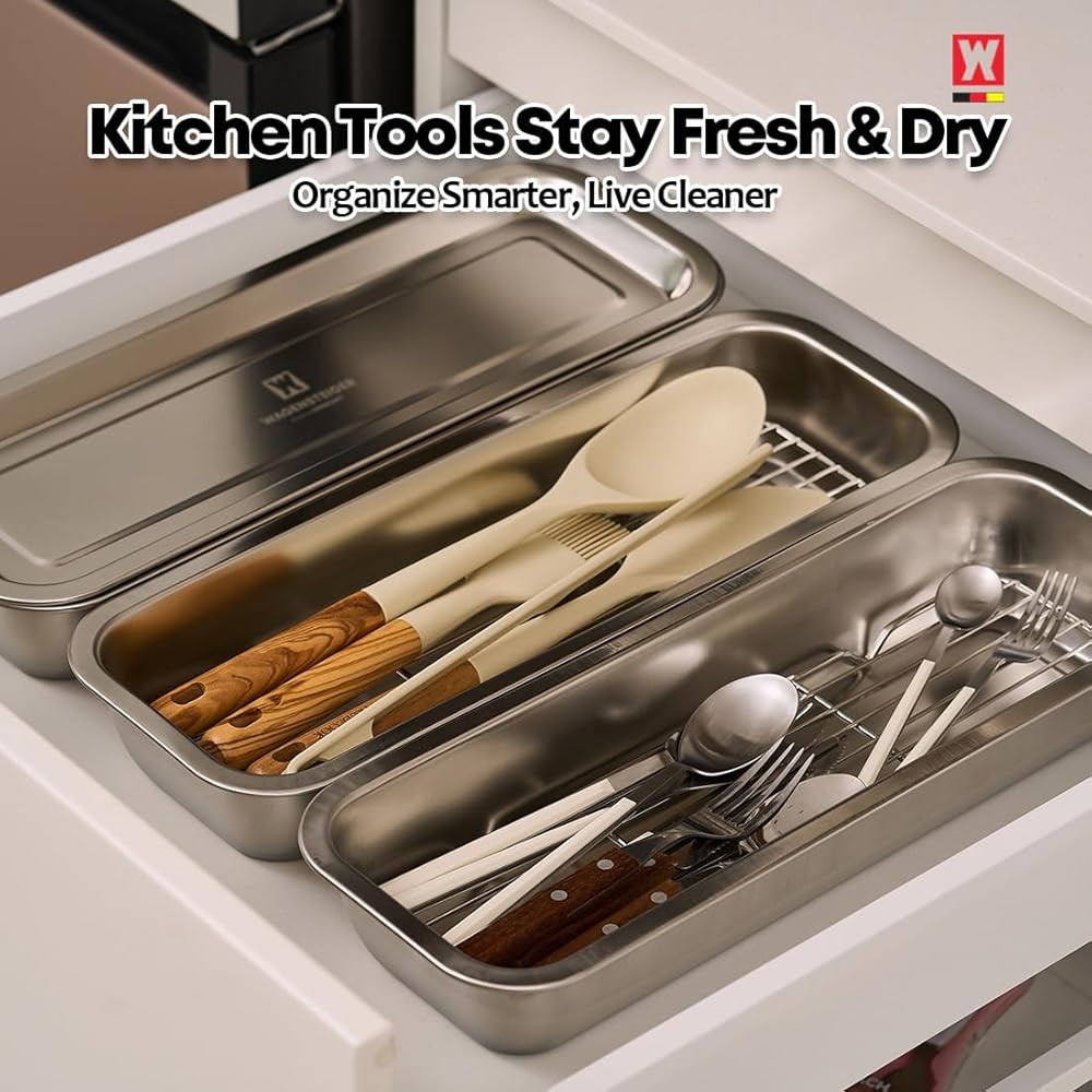 • KITCHEN ORGANIZATION MADE EASY: Ideal for arranging spoons, forks, chopsticks, cooking tools, and knives. Keeps essentials fresh, dry, and easy to reach. Fits most standard kitchen drawers and instantly upgrades your storage system.