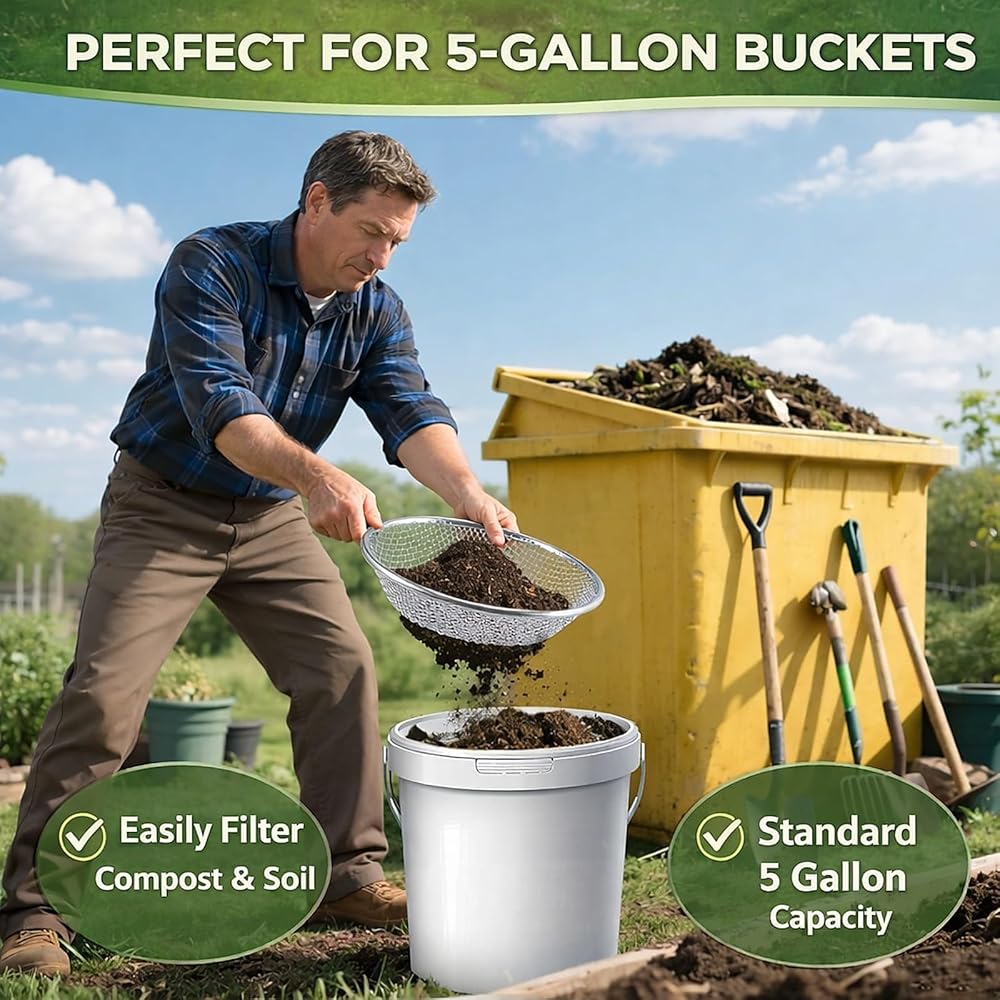 Fits Standard 5-Gallon Buckets Securely: Designed to sit steadily on most 5-gallon buckets for hands-free sifting. Compact and efficient for yard work and composting—great for home gardeners and DIY soil mixing.