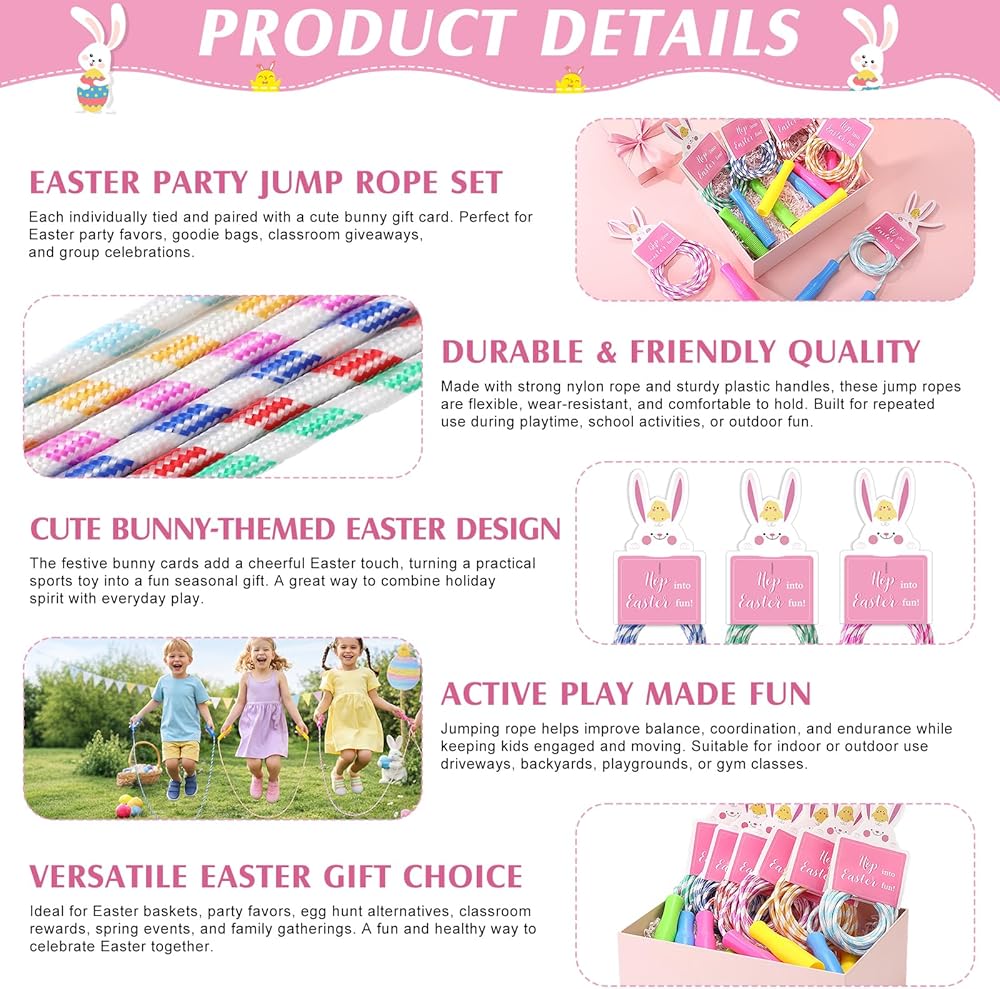 With 24 jump ropes in a vibrant range of colors, this set is ideal for group activities during Easter celebrations events, or outdoor play. Whether you're hosting a party, a family gathering, or a other event, these ropes encourage fun, active participation and bring people together for healthy, energetic fun.