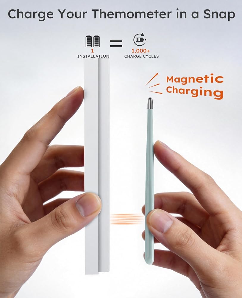 شحن مغناطيسي مع حقيبة محمولة: مزود بنظام شحن مغناطيسي وحقيبة شحن مريحة، يضمن مقياس الحرارة الرقمي هذا سهولة تجديد الطاقة والتخزين الآمن. لا داعي للقلق بشأن البطارية، فهو مثالي للاستخدام العائلي اليومي.