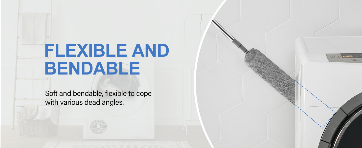 • منفضة ميكروفيبر مرنة - تأتي مع قطعتين من قماش الغبار من الألياف الدقيقة، يمكن لرأس الغبار المرن التقاط وامتصاص الغبار الناعم والشعر بسرعة تحت الأجهزة، والأثاث، والثلاجة، والجدران، والفجوات، والسرير، وأسفل الأثاث، والخزانة.