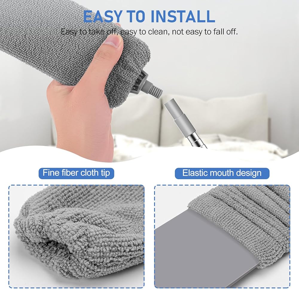 • قابلة للغسل وإعادة الاستخدام - من السهل تفكيك الغبار واستبداله وغسله. ما عليك سوى إزالة قطعة قماش الغبار المصنوعة من الألياف الدقيقة من العمود، وغسلها بالماء الدافئ، ثم علقها في مكان جيد التهوية لتجفيفها للاستخدام التالي.