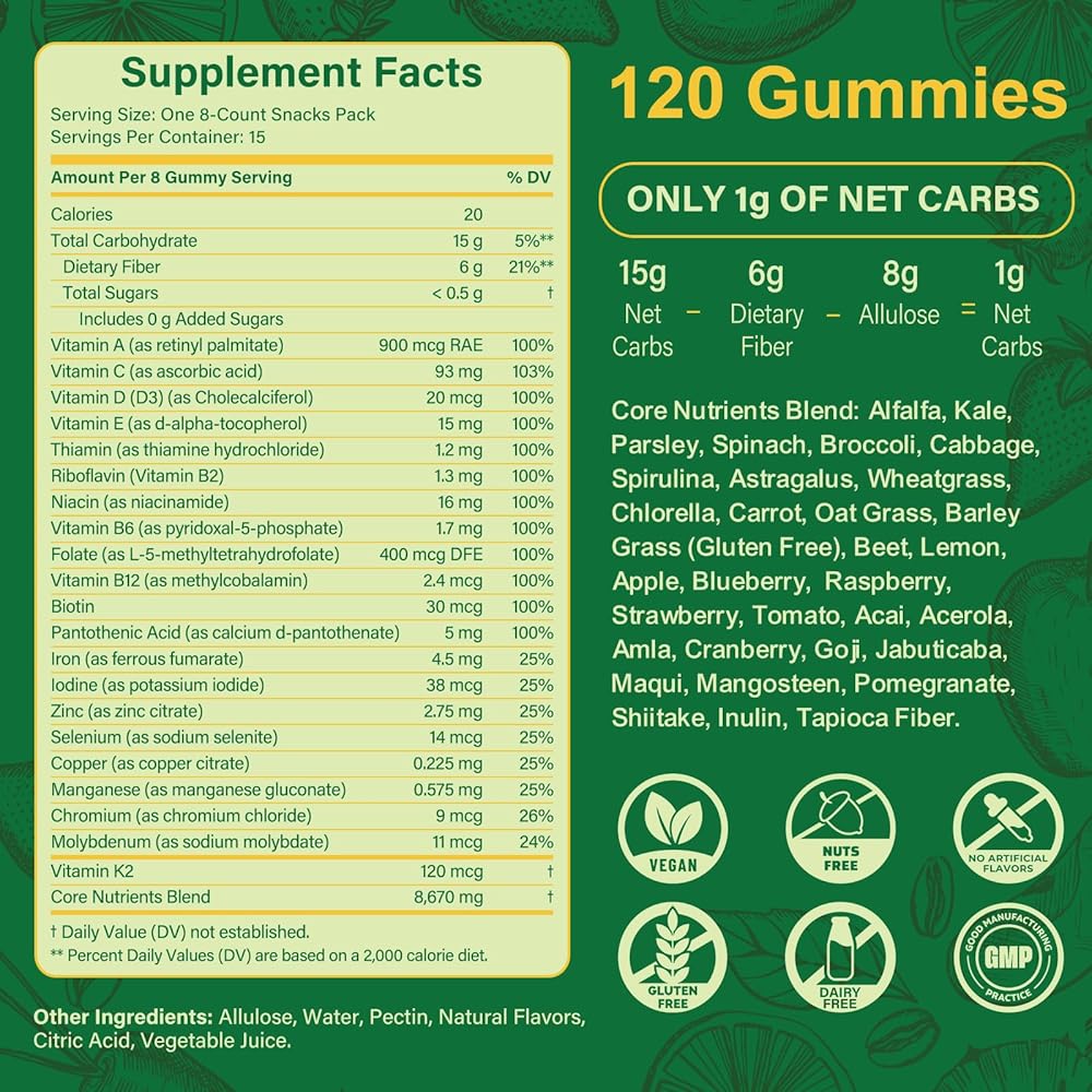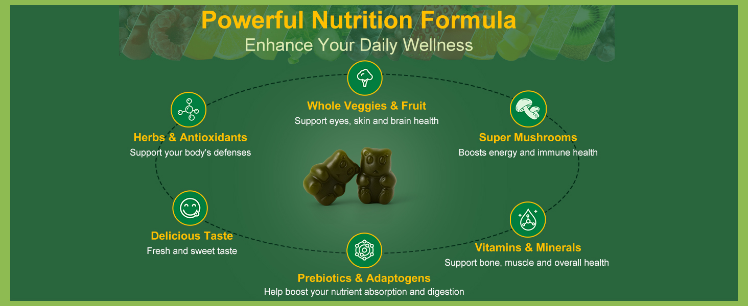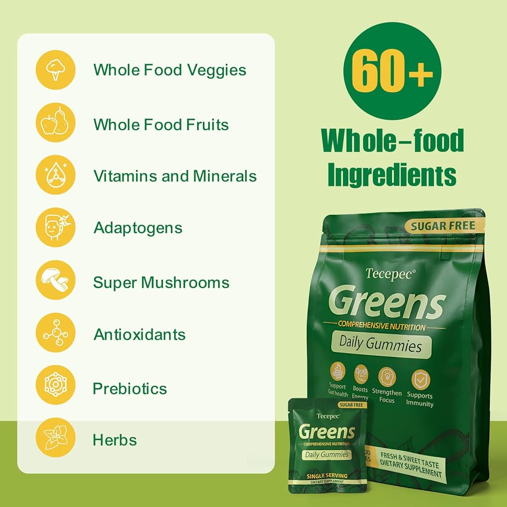 مكمل غذائي الكل في واحد وخالي من السكر: هذه العلكات الخضراء الحلوة والمنعشة عبارة عن مكمل متعدد الفيتامينات والفواكه والخضروات تم إعداده بعناية ومعبأ بـ 60 مكونًا قويًا للمساعدة في تحسين صحة الأمعاء والتوازن الهرموني وصحة المناعة والطاقة الطبيعية. تساعدك على البقاء نشيطًا ومركزًا ودعمًا للرفاهية العامة.