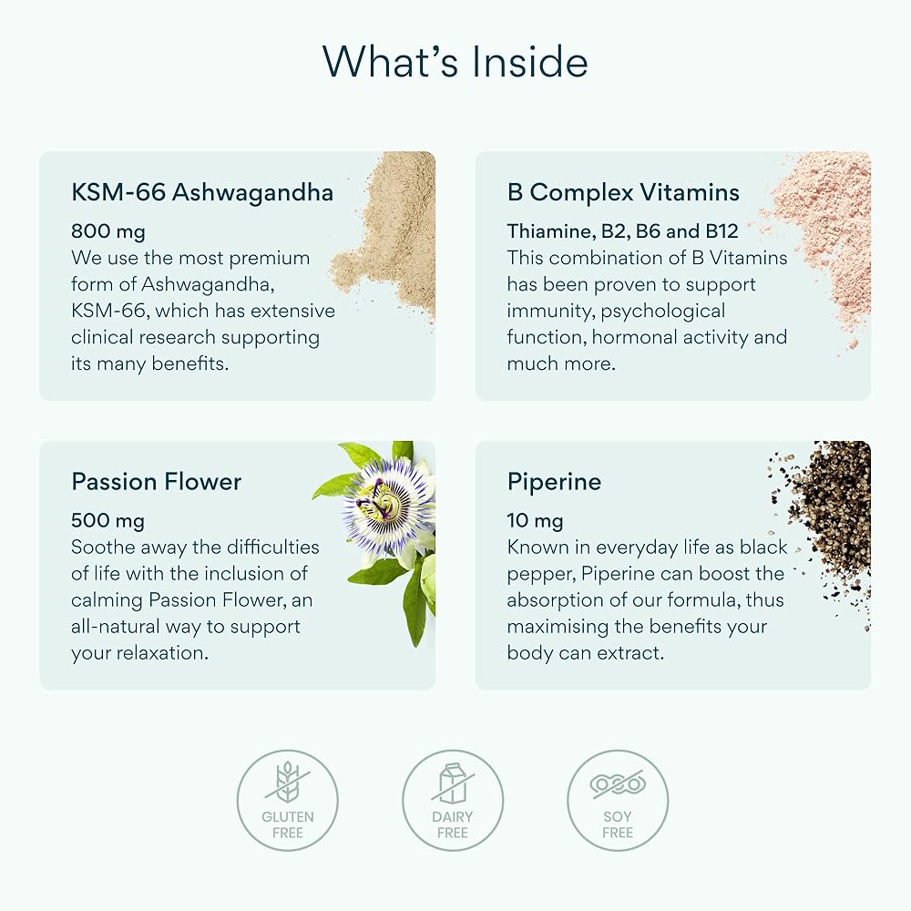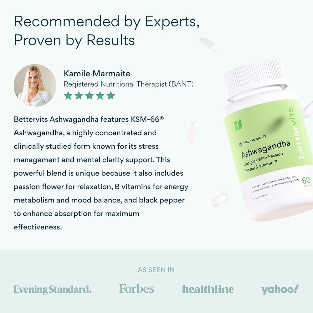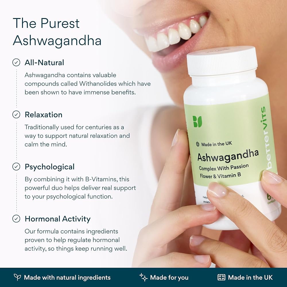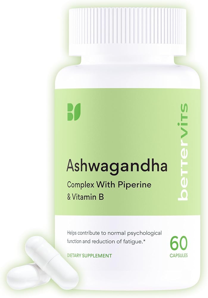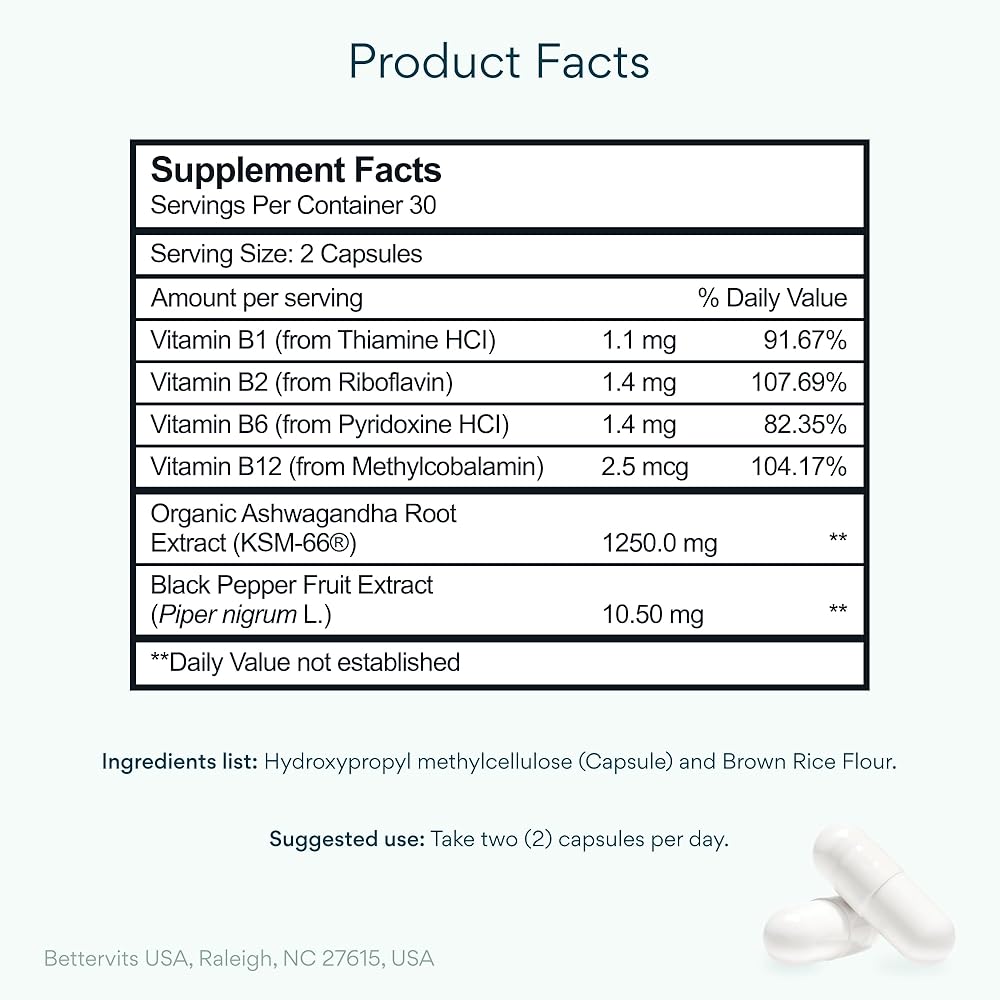 Find your sense of balance with Bettervits Ashwagandha Complex, combining KSM-66 organic root extract, Passion Flower, and a complete Vitamin B complex. This adaptogenic blend is thoughtfully crafted to help your body maintain calm focus, steady energy, and emotional well-being — ideal support for modern lifestyles that require both performance and peace of mind.* Ashwagandha, one of Ayurveda's most respected botanicals, is known for its role in helping the body adapt to occasional stress and promoting mental clarity.* Bettervits pairs this renowned root with Passion Flower, traditionally used to encourage relaxation and inner calm, while Vitamin B6 and B12 contribute to normal energy metabolism and psychological function.* Each capsule delivers consistent potency using the clinically studied KSM-66 extract, derived solely from the root for maximum concentration and purity. The result is a formula that supports balanced mood, calm focus, and resilience to everyday challenges without harsh stimulants or additives.* Bettervits products are produced in FDA-registered, cGMP-certified facilities following the highest quality and safety standards (21 CFR Part 111). Every batch is third-party tested by ISO 17025-accredited laboratories to confirm purity, potency, and compliance. Our formula is vegan, gluten-free, and non-GMO, offering a clean, plant-based choice for both women and men who value natural, science-backed supplementation. Whether taken in the morning for calm focus or in the evening to unwind, Bettervits Ashwagandha Complex helps you stay balanced — mind, body, and spirit.