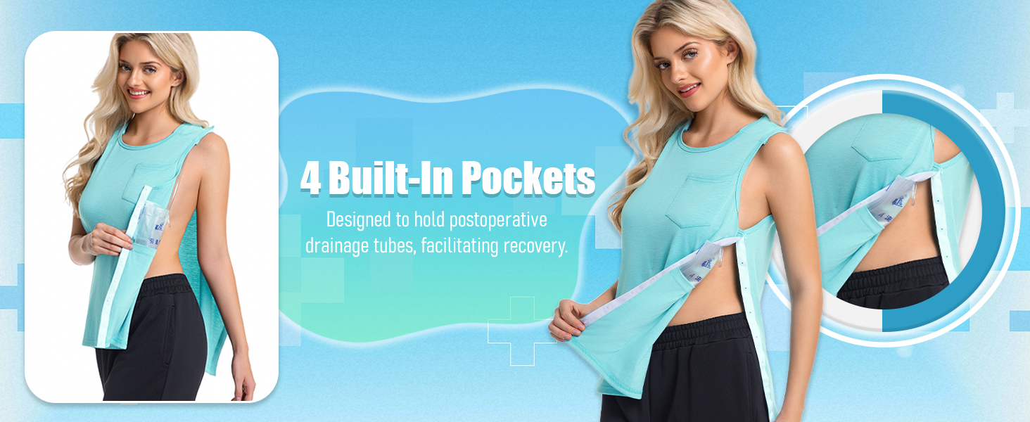 جيوب مخفية - مصممة خصيصًا للتعافي من عملية استئصال الثدي، وتتضمن أربعة جيوب مدمجة لحمل أكياس التصريف بشكل آمن على الجسم، ودعم الشفاء بعد العملية الجراحية بدون قلق.