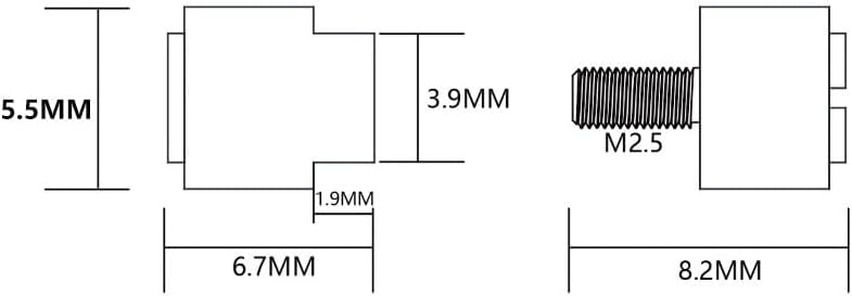 Size: nut diameter 5.5MM; screw diameter 3.9MM; screw length 1.9MM; Nut overall length 6.7MM; Screw overall length 8.2MM; Thread M2.5; suitable for blade thickness 2-2.8MM; see the second size diagram;