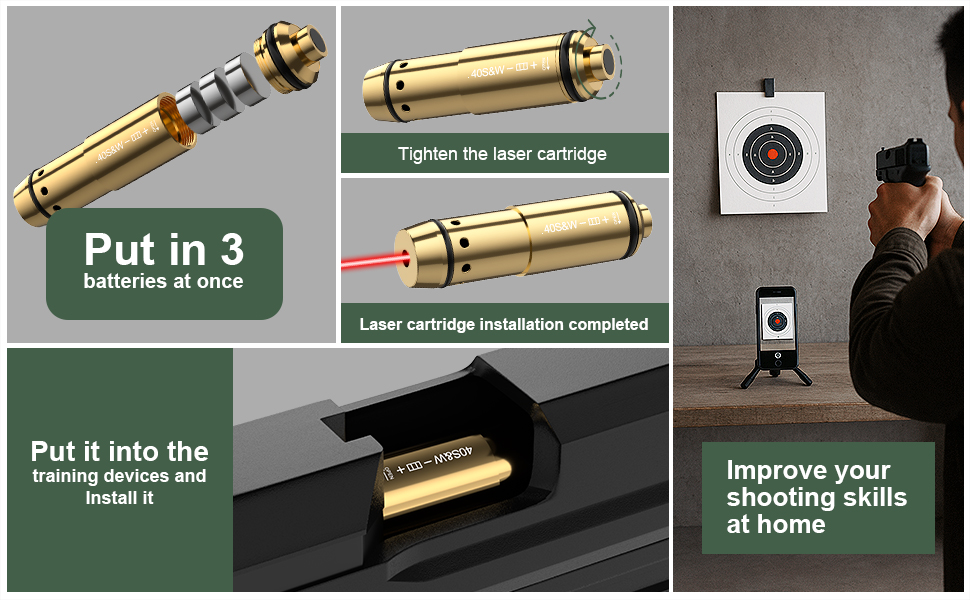 التوافق - خرطوشة الليزر مناسبة بشكل أساسي لعيار 40S&W، والشعاع مناسب لمعظم أنظمة التدريب على الرماية. إنه متوافق مع التطبيقات ويمكن استخدامه أيضًا مع معظم أنظمة التدريب على الحرائق الجافة مثل الأهداف الإلكترونية T1353.