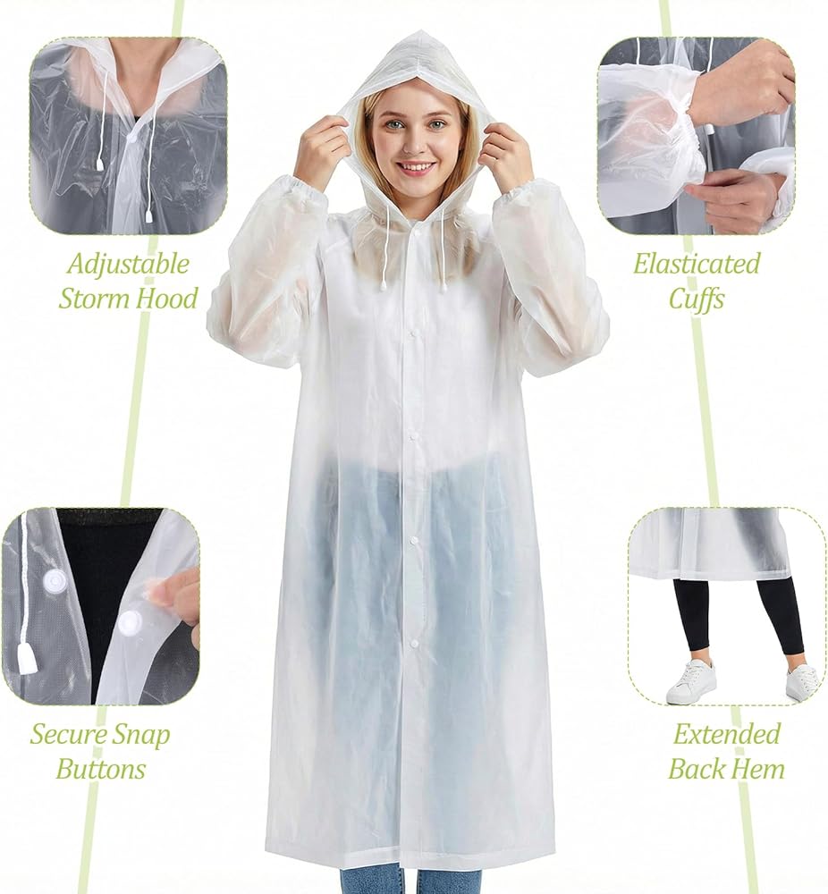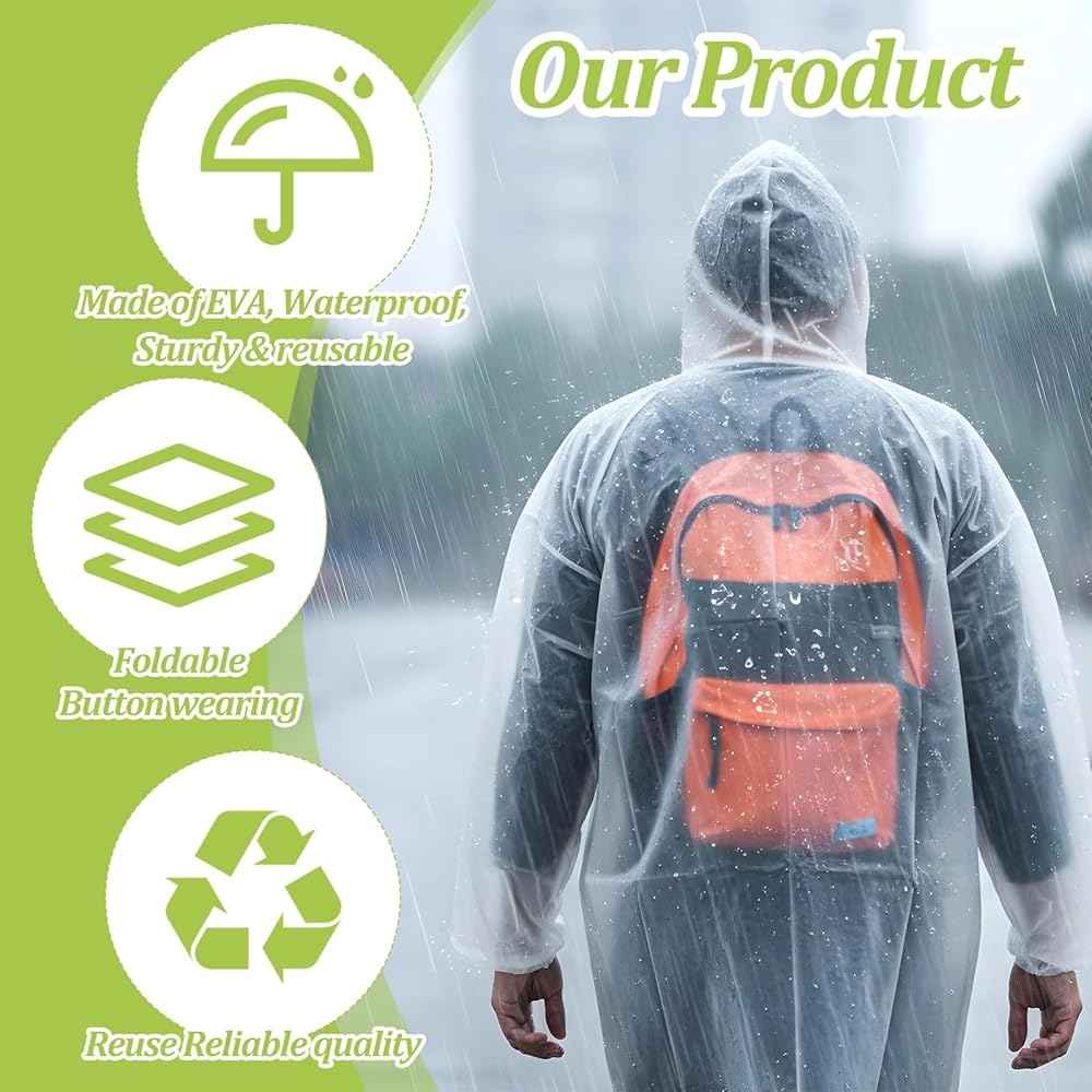 Reusable & Durable: This rain poncho for adults is lightweight yet ultra-waterproof, featuring a high-performance water-repellent coating that resists heavy rain. Made from 100% safe EVA material, this raincoat is thick and fully waterproof, reusable, offering a durable choice for daily rain protection, unlike flimsy disposable rain coats.