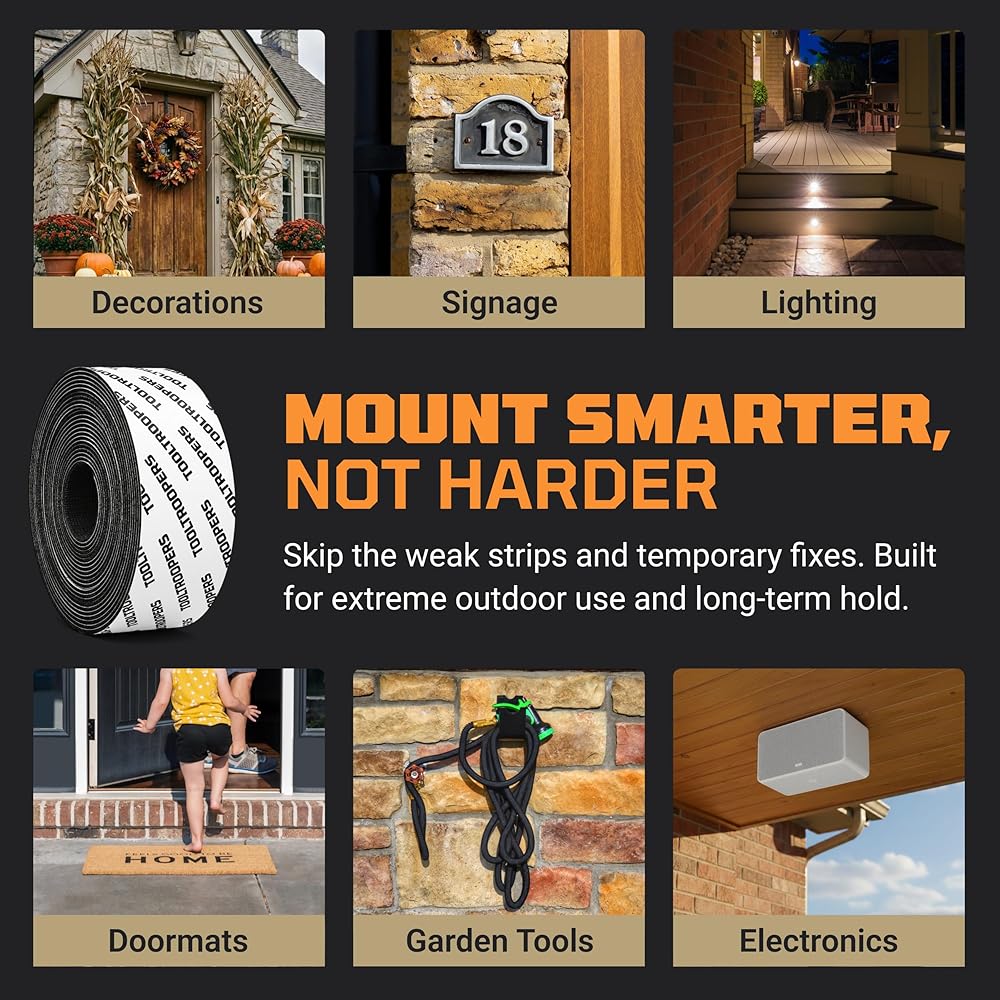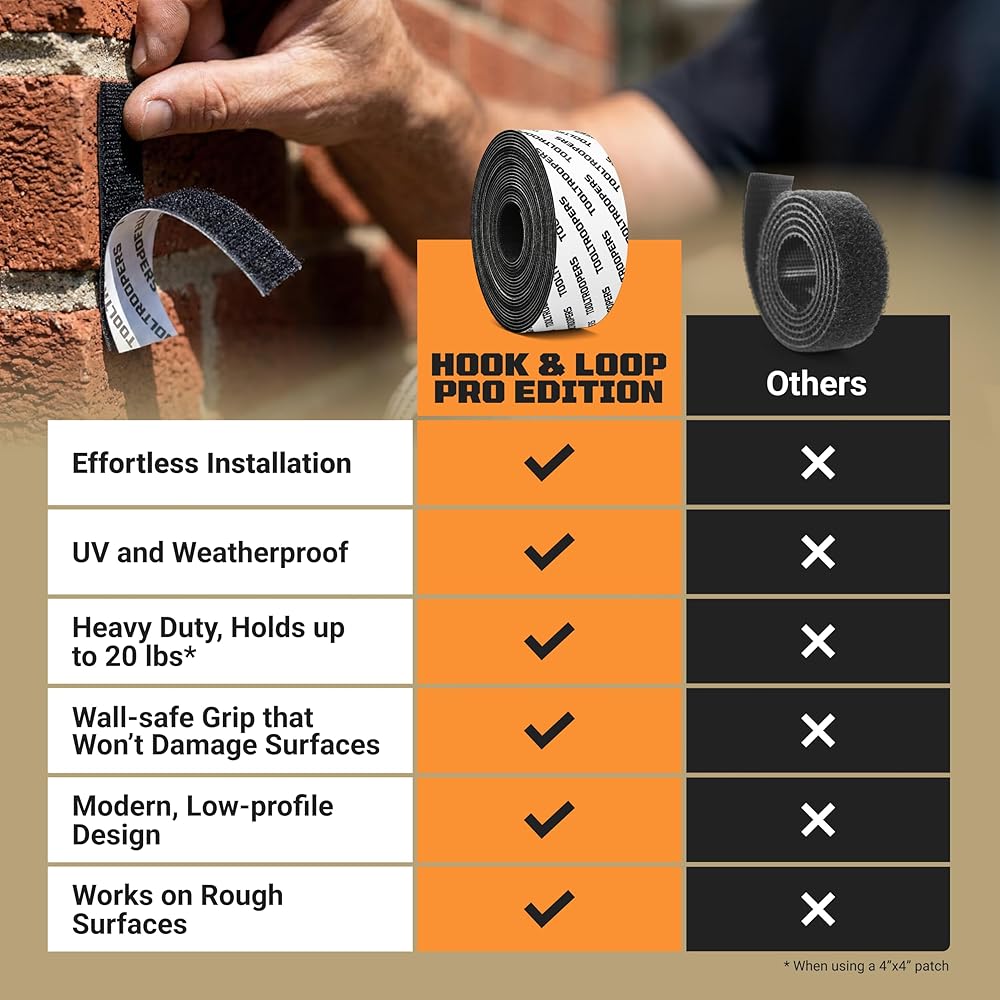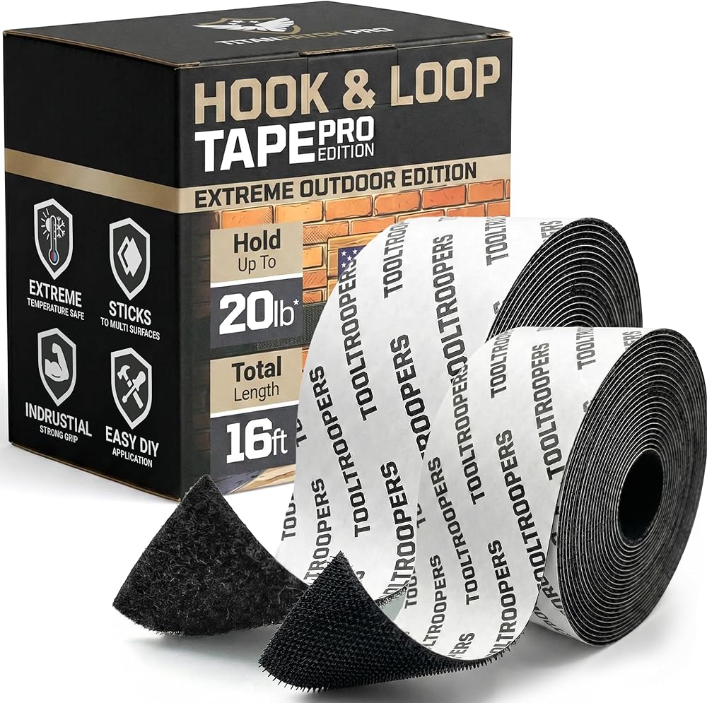 شريط تثبيت لاصق وحلقة شديد التحمل من TOOLTROOPERS - مصمم للاستخدام الخارجي الشديد مع لاصق قوي للغاية ومقاوم للأشعة فوق البنفسجية ومقاوم للطقس - يحمل ما يصل إلى 20 رطلًا على الطوب والخرسانة والأسطح الخشنة الأخرى - لفة بطول 16 قدمًا