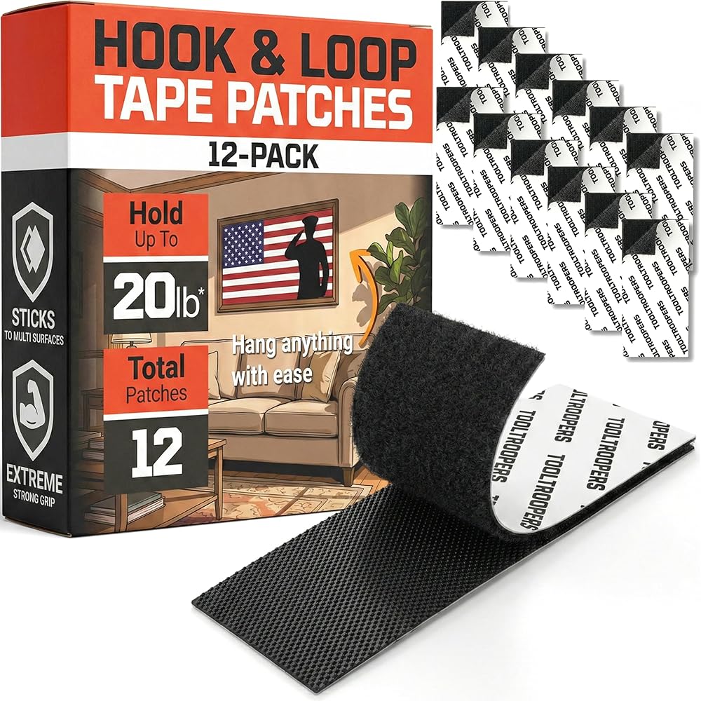 شرائط تثبيت بخطاف وحلقة شديدة التحمل من TOOLTROOPERS مقاس 4 × 2 بوصة (12 حزمة) - للاستخدام الداخلي والخارجي مع لاصق آمن على الحائط للأشعة فوق البنفسجية ومقاوم للطقس - يتحمل ما يصل إلى 20 رطل - تأمين السجاد ووسائد الأريكة أو تنظيم الكابلات