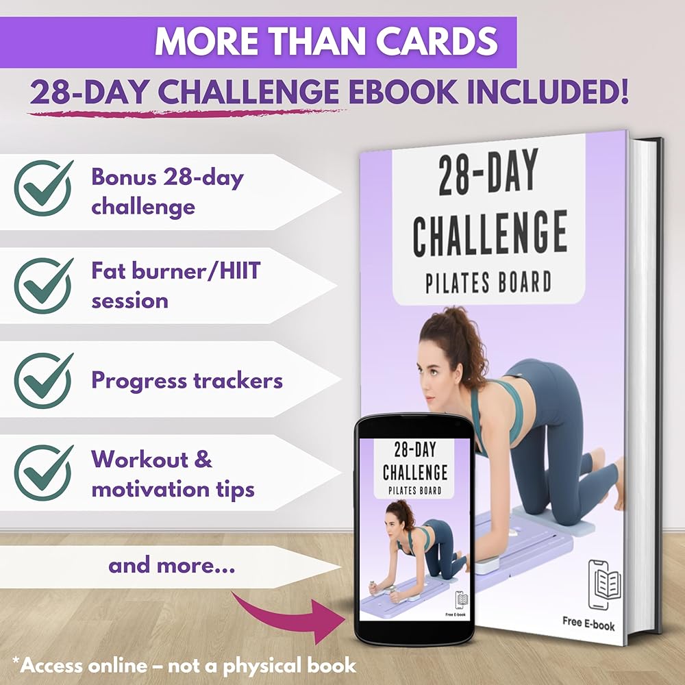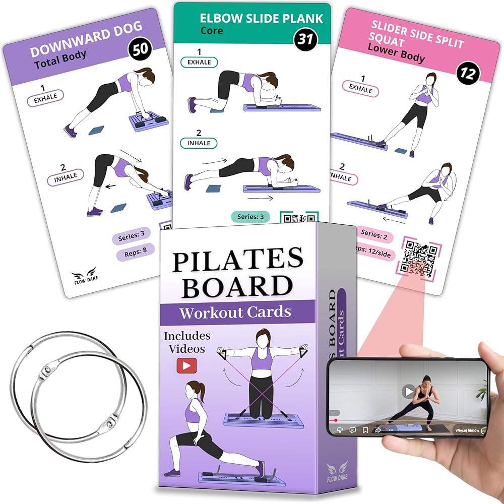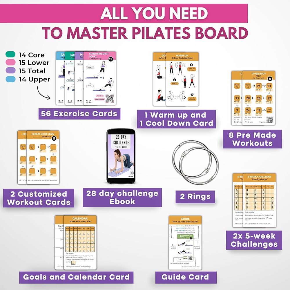 بطاقات تمرين لوحة البيلاتيس - 67 بطاقة تمرين مع مقاطع فيديو وخطة تمرين - تتضمن تحدي 5 أسابيع، وكتاب إلكتروني، ومخطط التقدم وحلقتين لسهولة التنظيم - دليل الإصلاح المنزلي المحمول للنساء