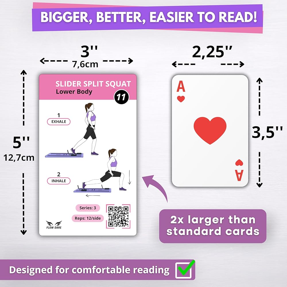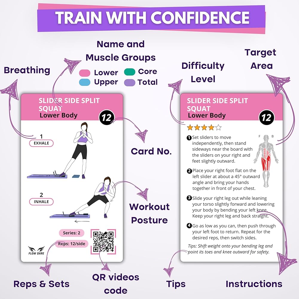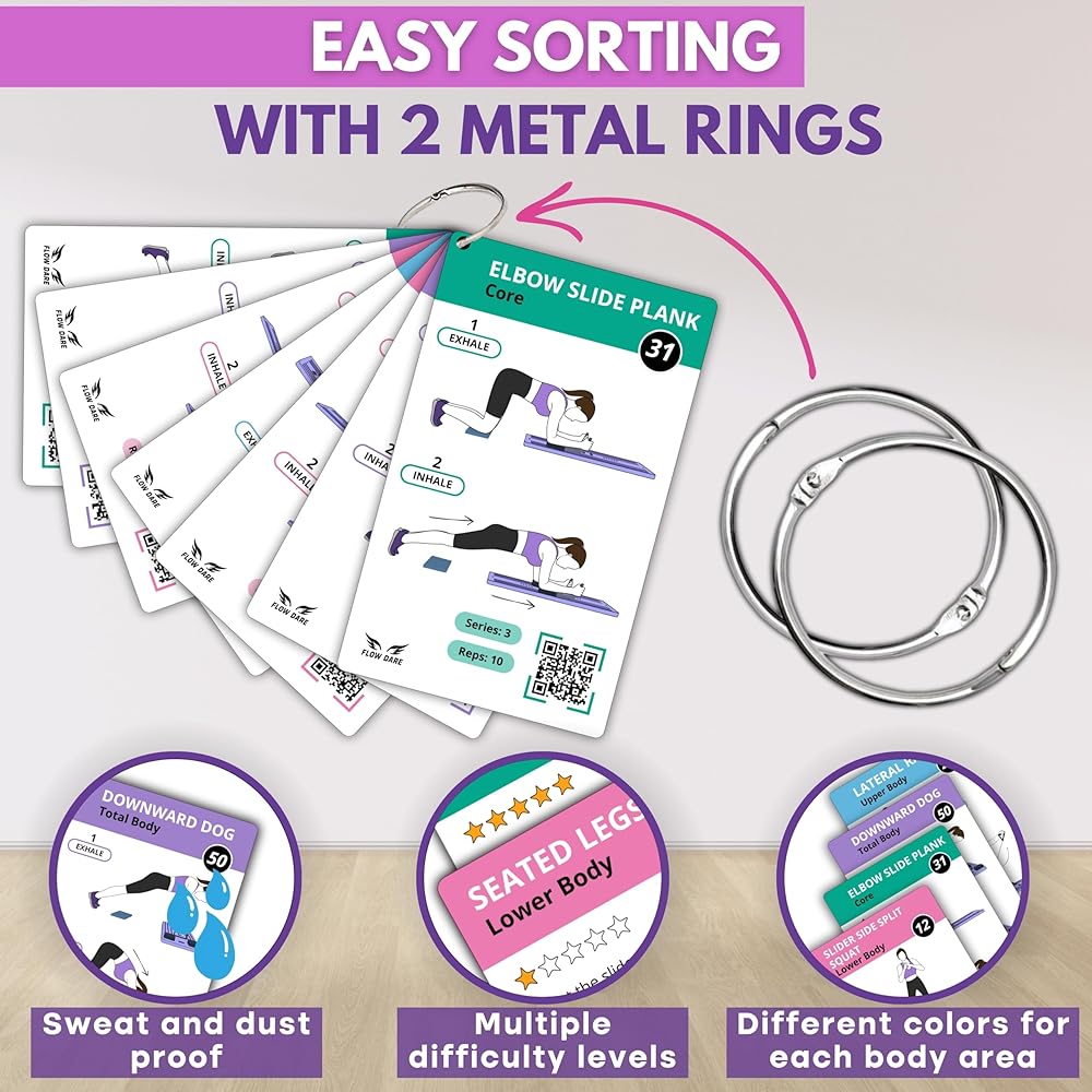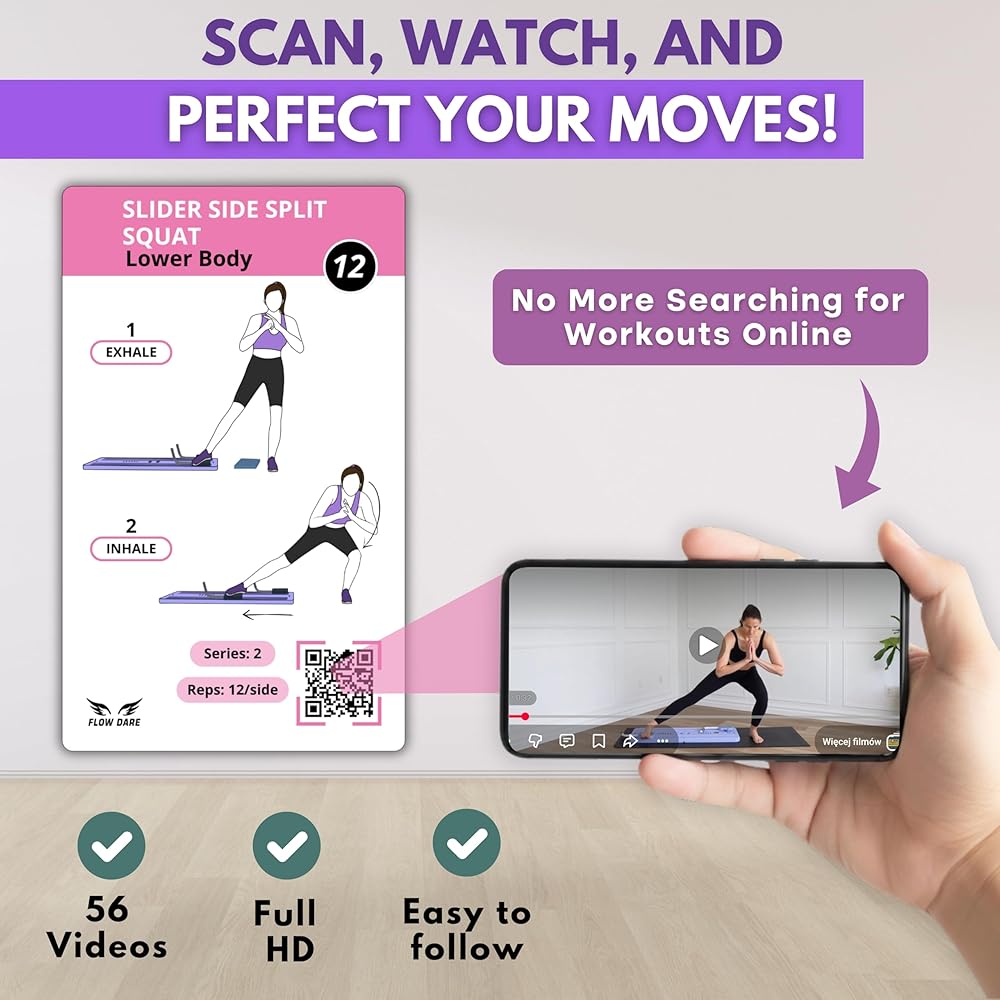 • شاهد وتحرك بثقة - تشتمل كل بطاقة على فيديو تعليمي عبر رمز QR، بالإضافة إلى رسوم توضيحية واضحة وتعليمات خطوة بخطوة. لا مزيد من البحث عن التدريبات عبر الإنترنت. تابع بثقة وقم بأداء كل حركة بشكل صحيح لتحقيق أقصى استفادة من كل جلسة. مثالي لأي شخص يريد إرشادات واضحة ودقيقة.