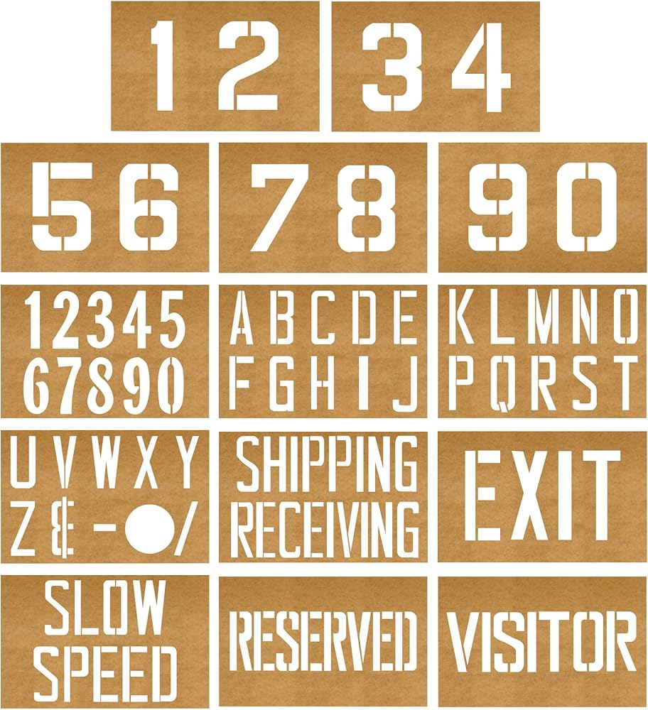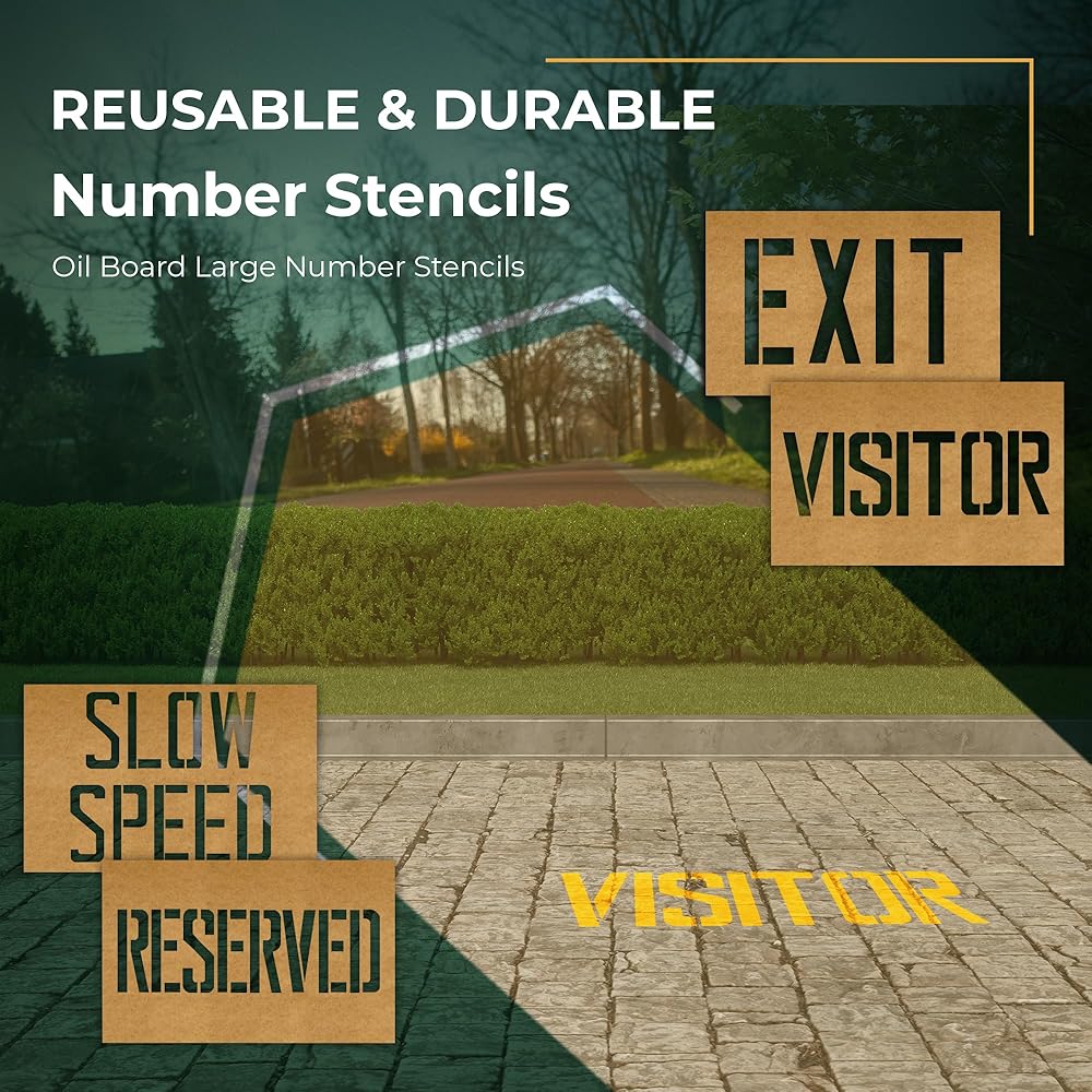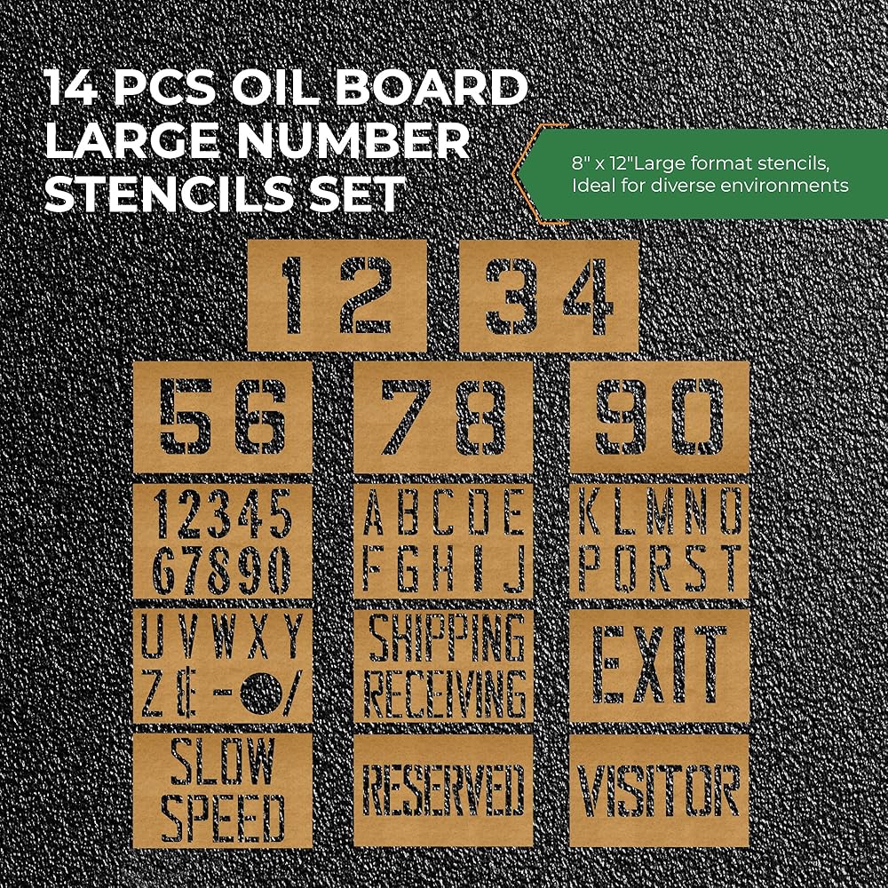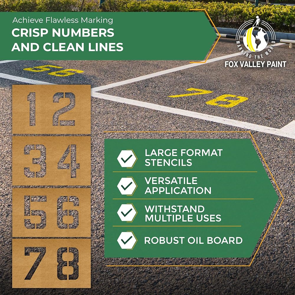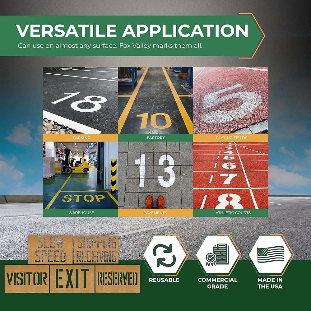 استنسل طلاء Fox Valley لمواقف السيارات - مجموعة استنسل مصنع ألواح الزيت 14 قطعة، مجموعة علامات الطريق والأرضيات، علامات الخرسانة والرصيف 8 بوصة × 12 بوصة