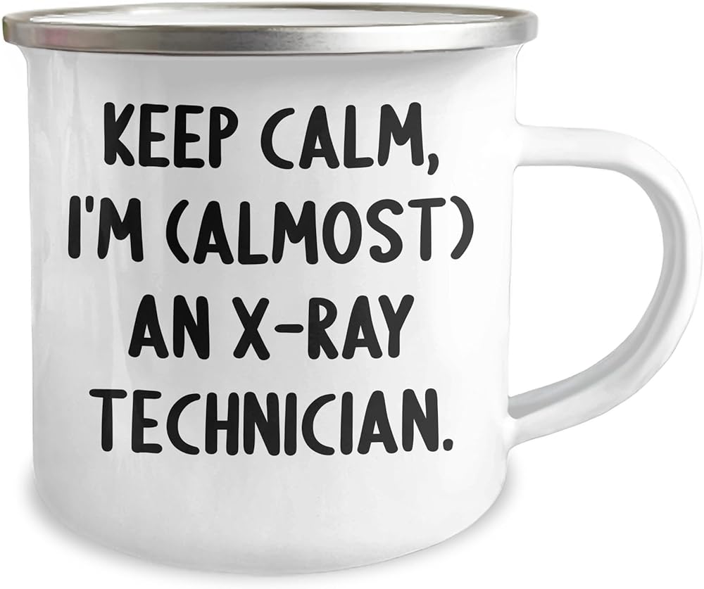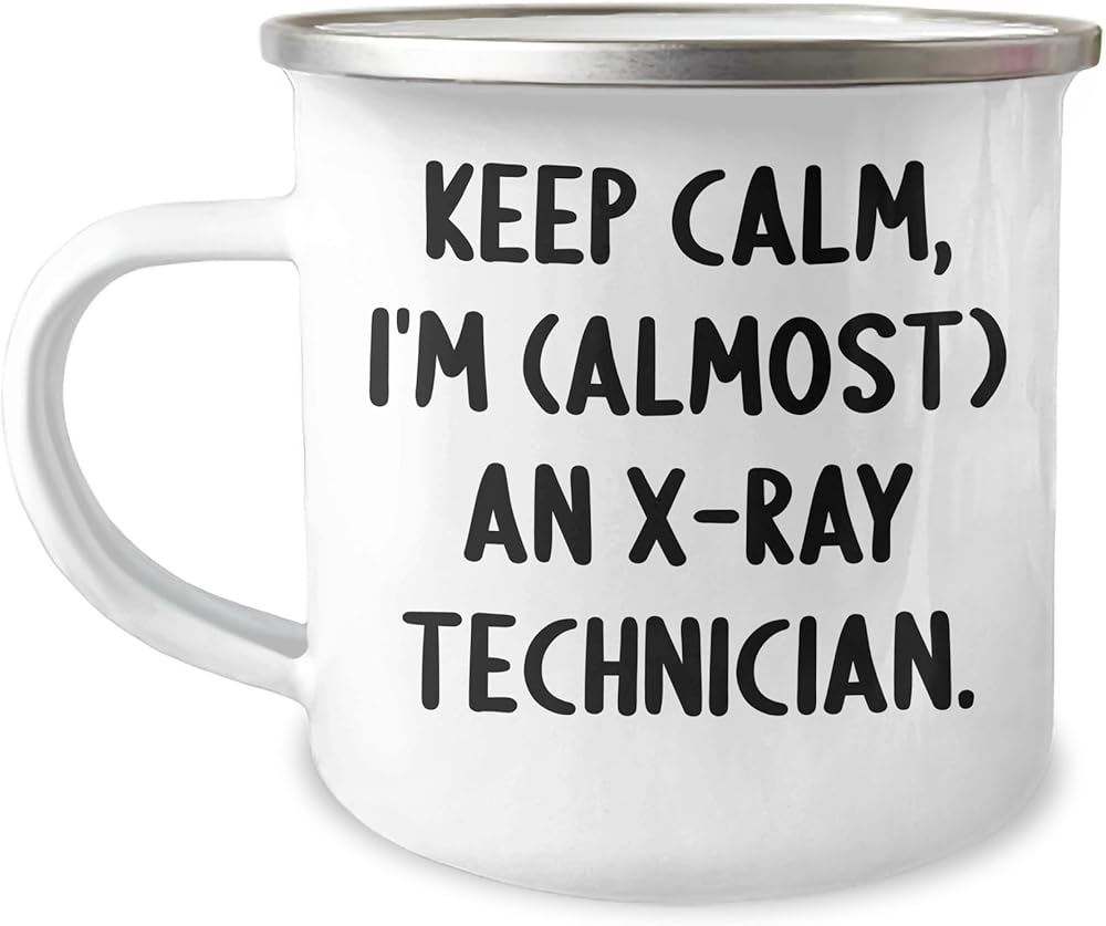 Are you an X-ray technician or looking for a unique birthday gift for someone in the medical field? Our Keep Calm, Almost an X-ray Technician camping mug is the perfect way to celebrate their profession and sense of humor. Made from stainless steel with enamel finish, this 12 oz camping mug is easy to clean and maintain, and the permanent printing will not fade after washing.