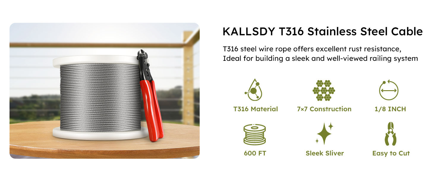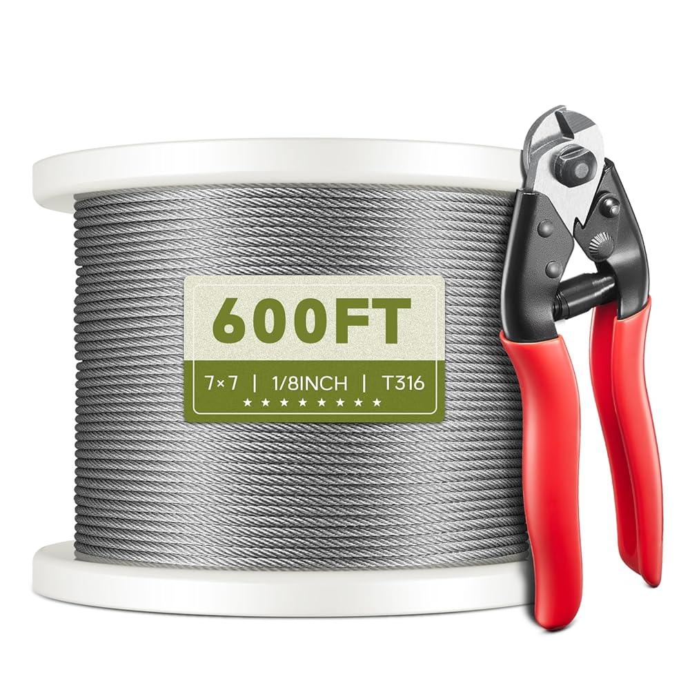 كابل من الفولاذ المقاوم للصدأ T316 بطول 500 قدم، 1/8 بوصة، كابل طائرة بحبل سلكي لمجموعة درابزين كابل سطح السفينة والدرابزينات DIY، بناء جدائل 7 × 7، يأتي مع قاطع