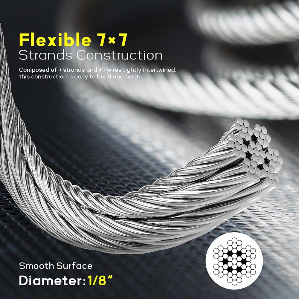 قطر رائع 1/8 بوصة: يوفر التصميم ذو القطر الدقيق لكابل السلك الخاص بنا قوة كافية دون أن يبدو ثقيلًا جدًا، ومناسب لديكورات الحدائق الحساسة، مثل أسوار الفناء، وقضبان السطح، ودعم تسلق النباتات. يمكن استخدامها أيضًا لتعليق الأشياء، مثل الأضواء الخيطية والصور وأشرعة الشمس والملابس