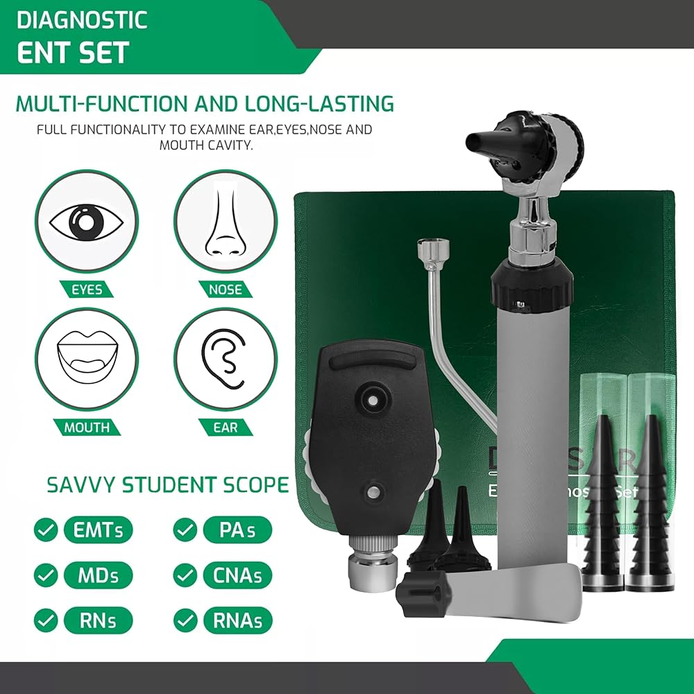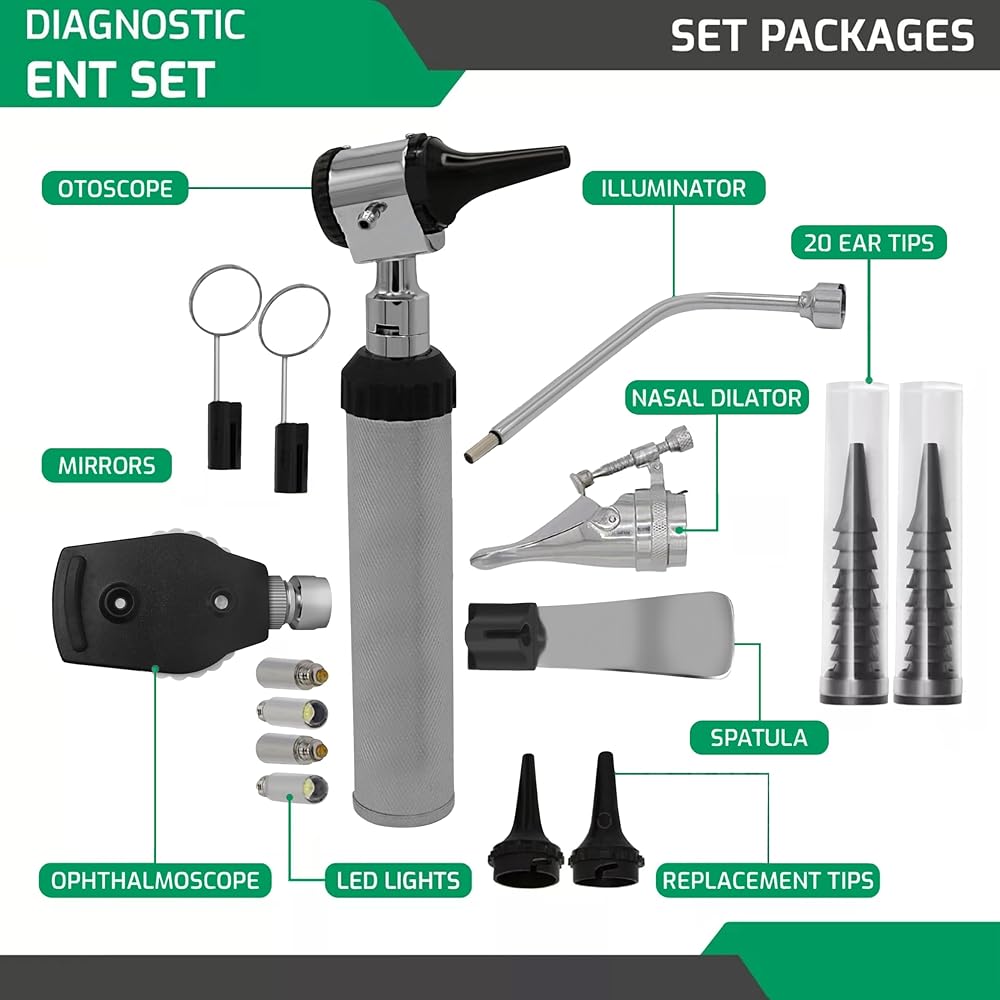 Practice, perfect, and test your ENT diagnostic skills with a full-function scope kit for eye, ear, nose, and throat. Have the right supplies to be prepared for any clinic with your ZetaLife kit by Zyrev. 👌[Versatile Visualization] – Walk the ward with a full set of ENT tools. The kit comes with everything in the picture including one handle, one otoscope head with light, one opthalmoscope head, 3 reusable ear speculums, 1 illuminator, 2 mirrors, 1 nasal adapter, 1 tongue depressor, 20 disposable specula and 4 replacement bulbs. Uses 2 standard C cell batteries (not included).