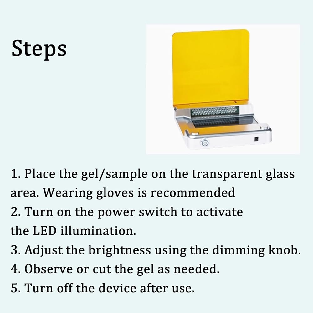 • Customizable Brightness & Flexible Observation: The rotary knob allows for adjustable brightness with memory recall for repeated use, while the multi-angle filter system enables precise gel cutting and various observation angles.