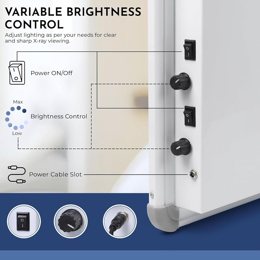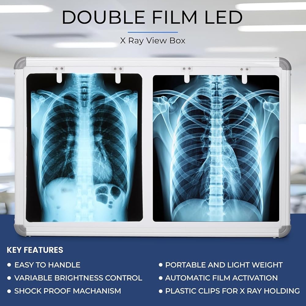 Transform your medical imaging workflow with this professional-grade double film LED X-ray view box set. Each unit features a generous 28x17 inch viewing area, perfect for examining multiple films simultaneously. The innovative automatic film activation sensor provides hands-free operation, while the variable brightness controller allows precise illumination adjustment for optimal image clarity. The sleek white design complements any medical facility's décor. This pack of two view boxes offers consistent, uniform lighting across the entire viewing surface, making it easier to detect subtle details in radiographs. The LED technology ensures long-lasting performance and reliable operation. These view boxes are ideal for hospitals, clinics, dental offices, and other healthcare settings where accurate radiographic interpretation is essential. The modern design incorporates user-friendly features while maintaining professional standards for medical image viewing.