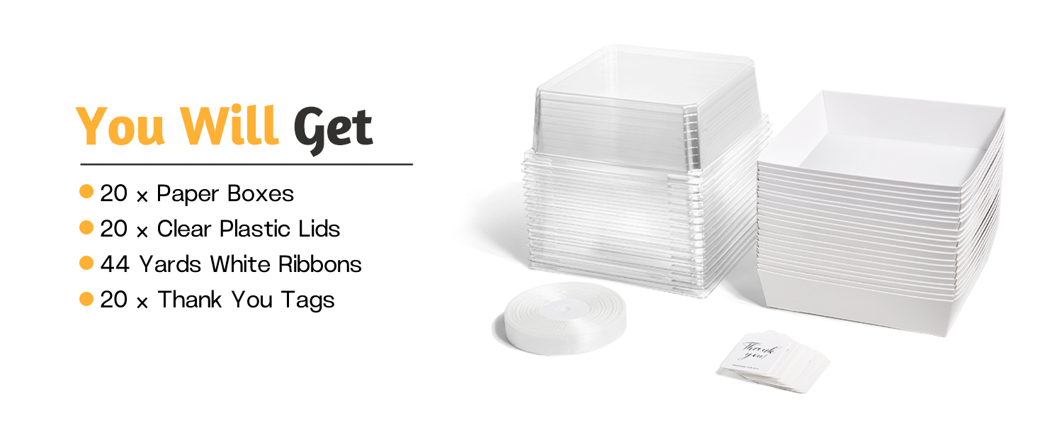 عبوة قيمة رائعة: تحتوي العبوة على 20 قطعة من صناديق الكيك مقاس 7 × 7 × 4 بوصة مع أغطية، و20 قطعة من بطاقات الشكر وشريط أبيض بطول 44 ياردة، رائعة لتقديم الحلويات في الحفلات.
