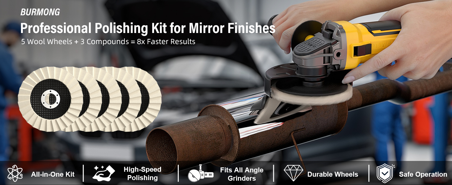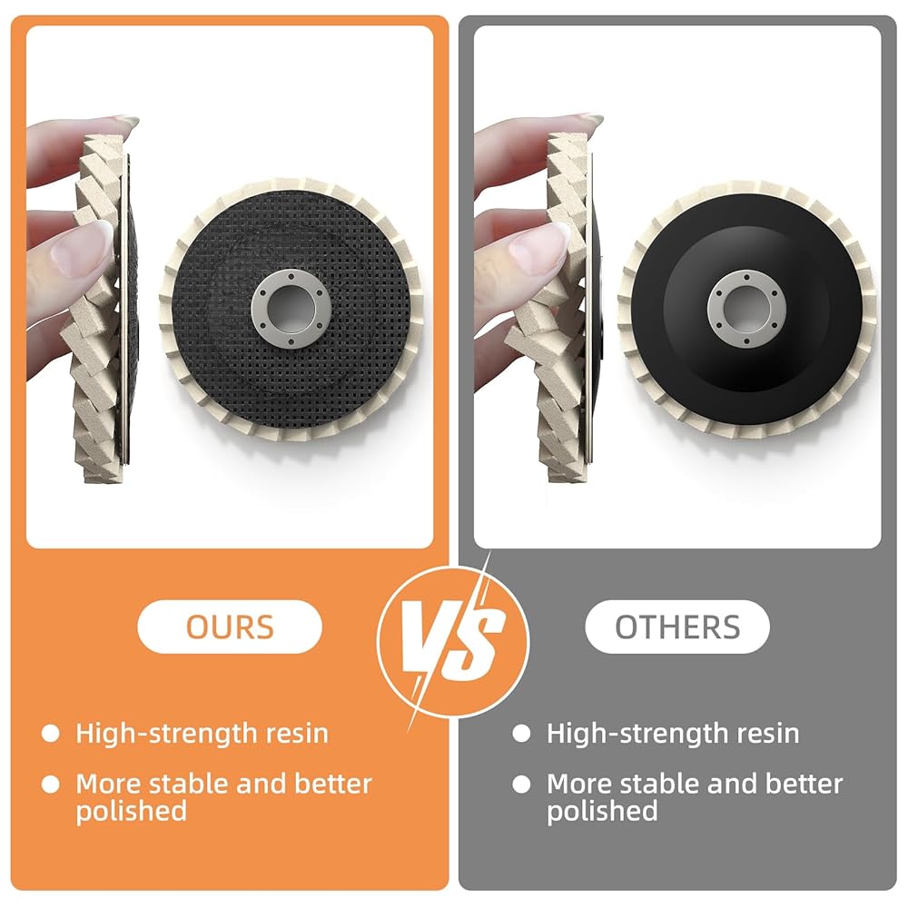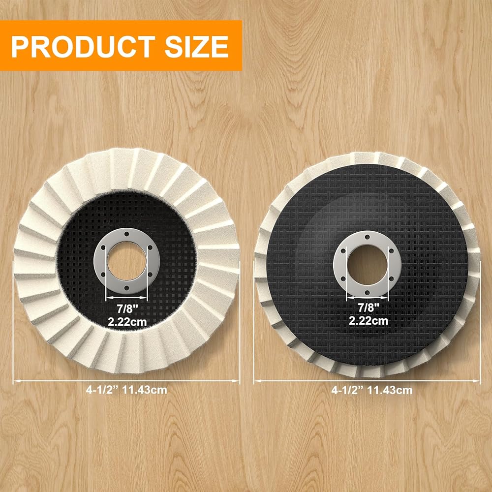 • توافق مطحنة الزوايا العالمية 4.5 بوصة: يبلغ قطر كل عجلة 4.5 بوصة مع فتحة أربور 7/8 بوصة، تناسب معظم المطاحن الزاوية القياسية 4.5 بوصة. يتيح هيكل الصوف المرن تلميعًا سلسًا ومحكمًا على الأسطح المسطحة والمنحنية وغير المنتظمة.