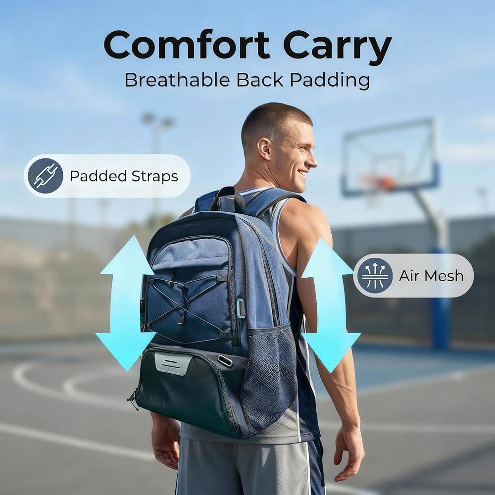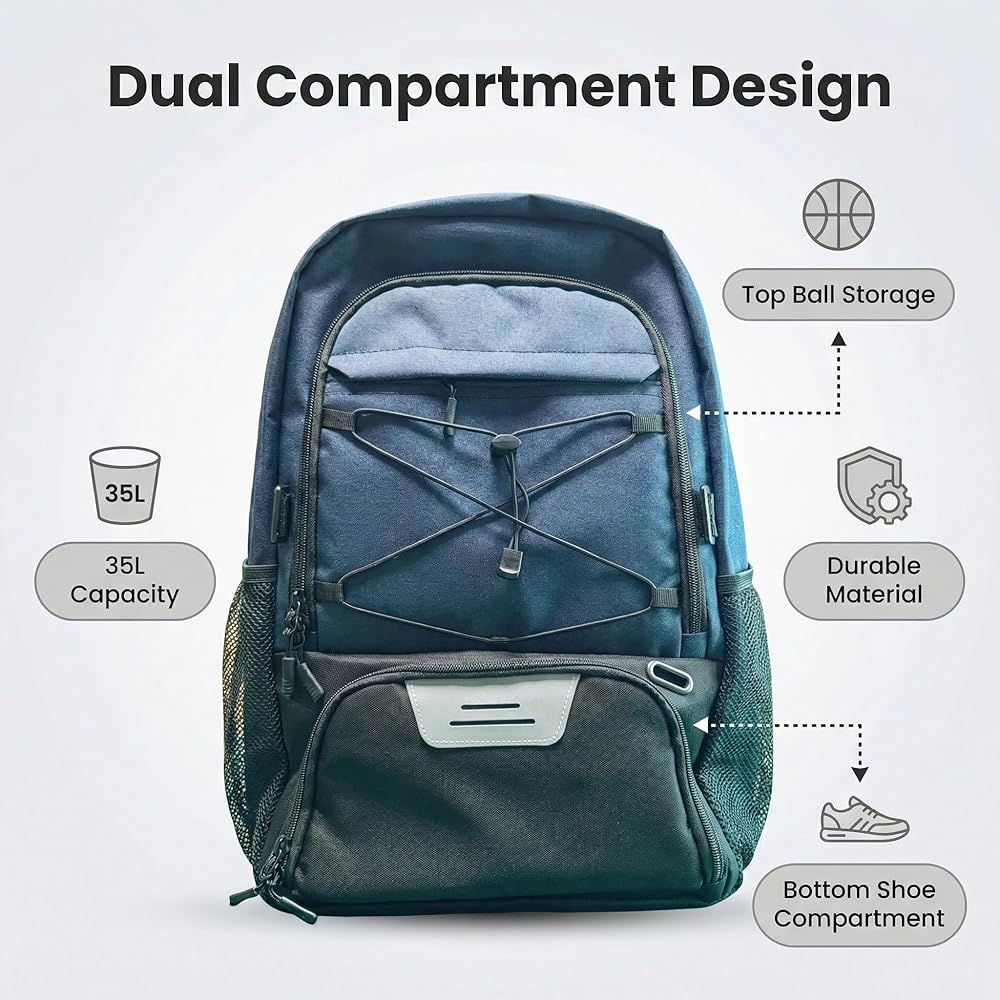 Designed for athletes, this 35L multi-sport backpack combines large capacity with smart organization. It features a dedicated ventilated shoe compartment to isolate odors, a separate ball pocket (fits size 7 basketball/size 5 soccer ball), a padded 15.6" laptop sleeve, and side water bottle pockets. Built from water-resistant, durable materials, it offers all-day comfort with thickly padded shoulder straps and an adjustable chest strap for stable, bounce-free carry. Perfect for basketball, soccer, volleyball, training, and daily commute—keep all your gear organized, fresh, and ready for the game.