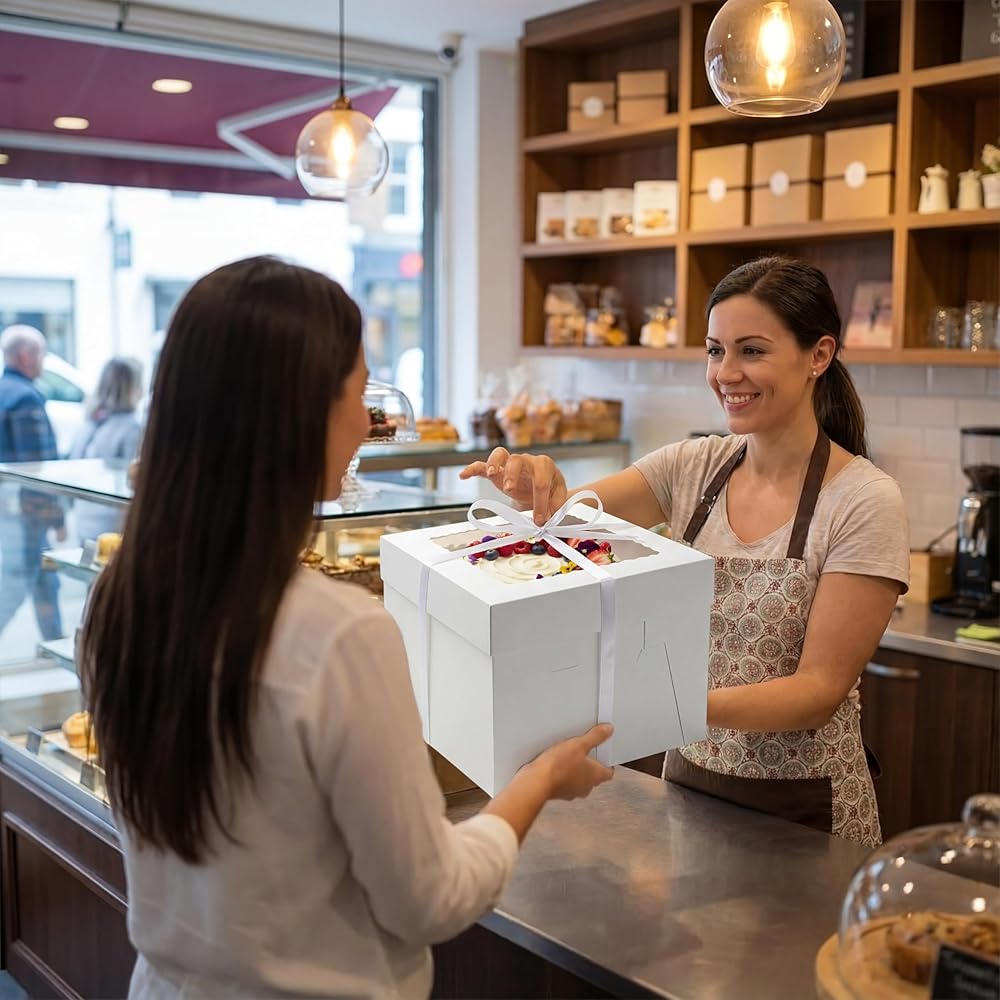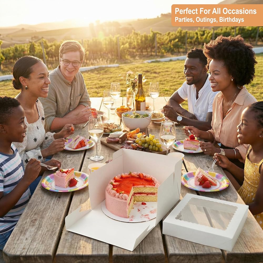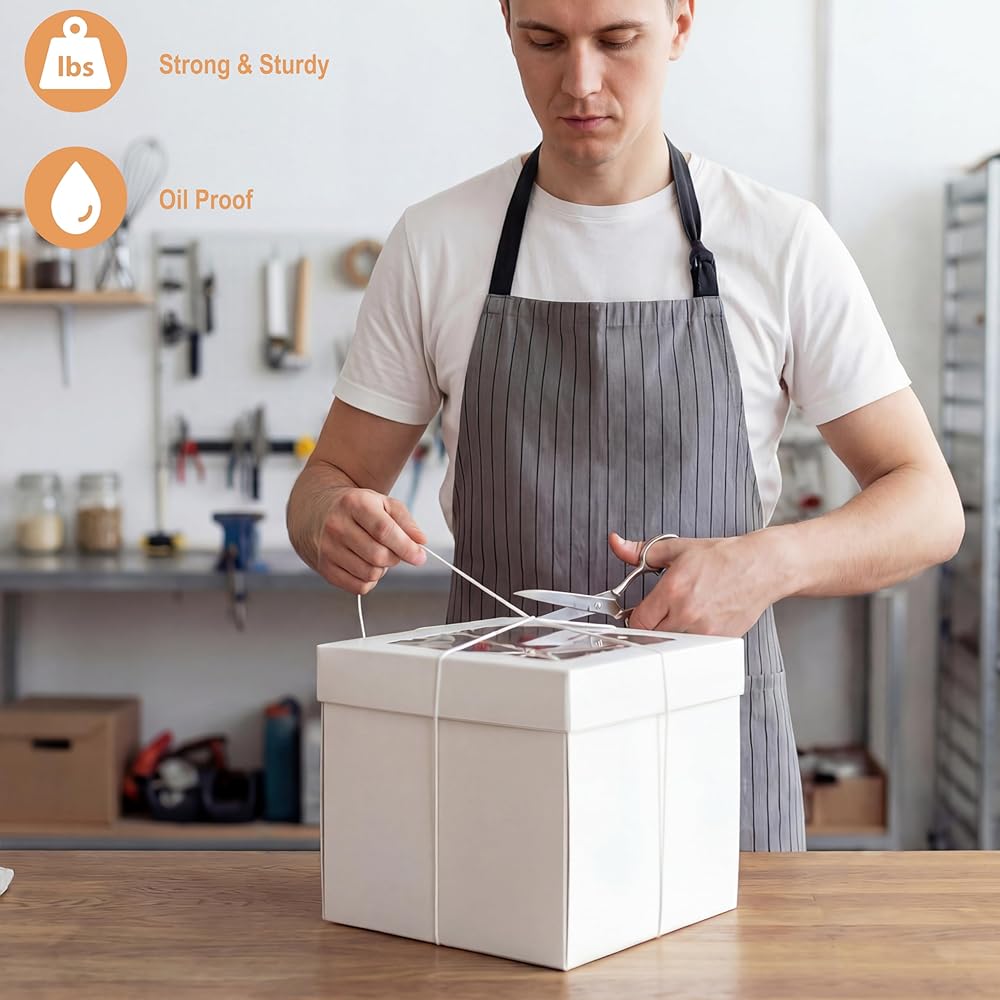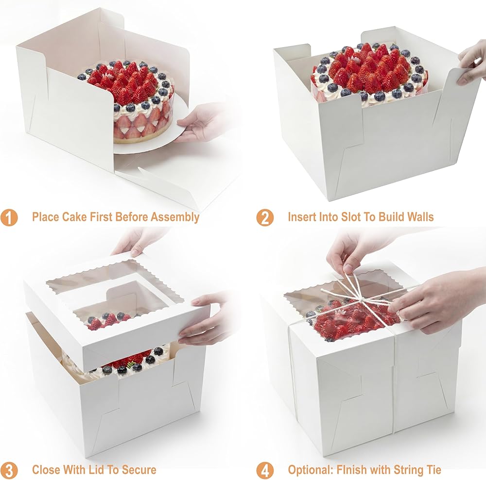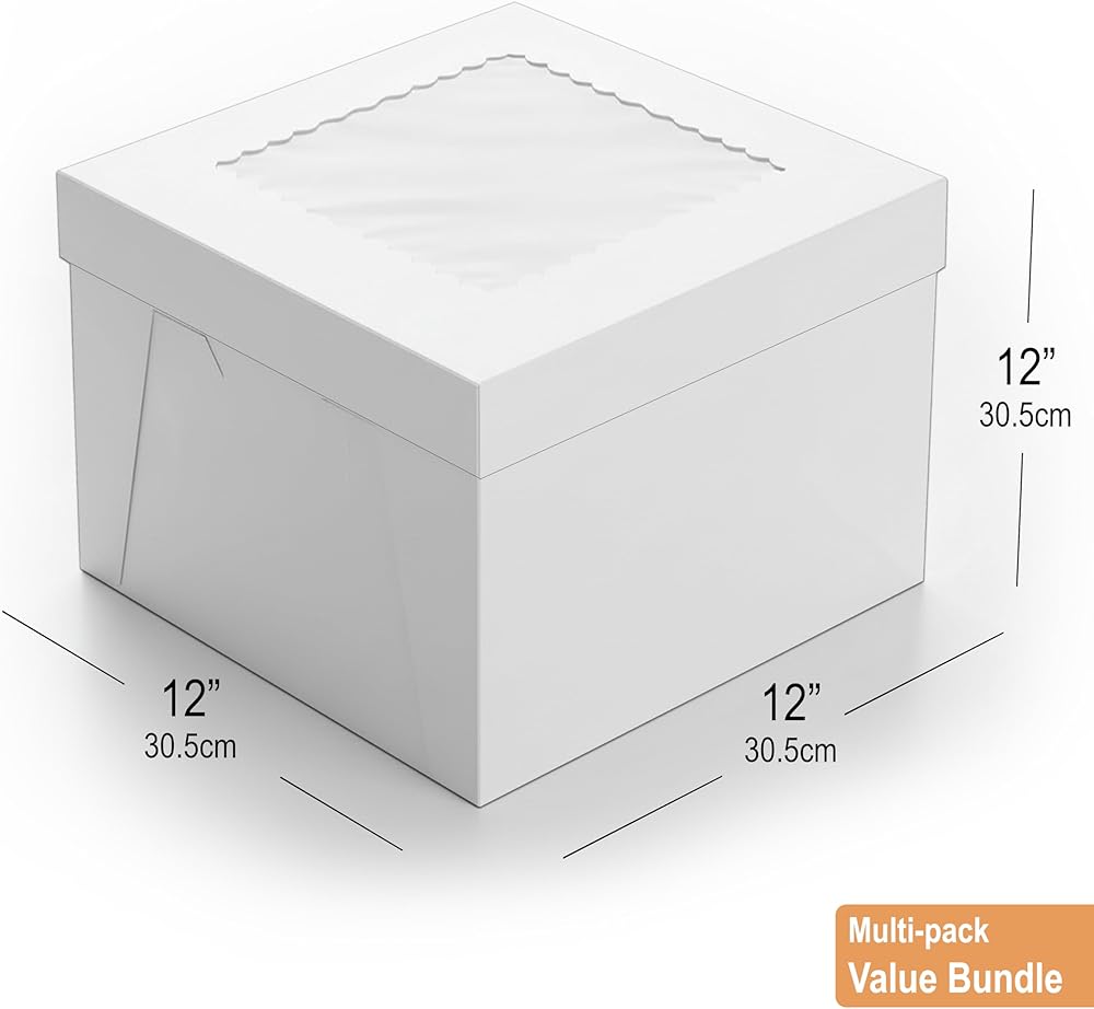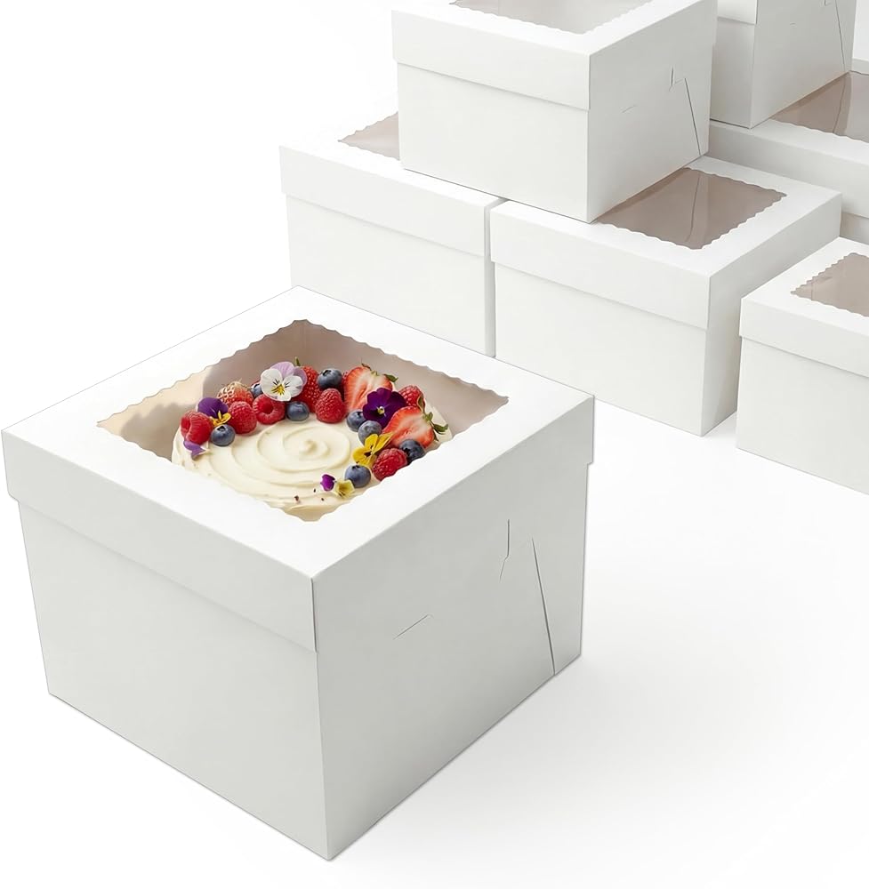 Transport and showcase your baked goods with confidence and style using our premium Cake Boxes with Clear Window, available in 8-inch, 10-inch, and 12-inch sizes. Designed with both home bakers and small businesses in mind, these cake boxes offer the perfect combination of durability, elegance, and practicality. Made from sturdy, food-safe cardboard, these boxes ensure your cakes remain safe and intact during transport. Whether it's a multi-layer cake or smaller treats like cookies, pies, donuts, or cupcakes, these boxes provide ample space and reliable support to keep your creations pristine. The clear window on top adds a professional and polished look, allowing your cakes or desserts to shine while safely enclosed. The classic white design enhances the presentation, making these boxes ideal for gifting to loved ones or handing off baked goods to customers. Assembly is quick and hassle-free thanks to pre-folded lines and a flat-packed design that prevents damage during transit. Simply follow the instructions, and your sturdy cake carrier will be ready in seconds. These disposable cake carriers are sturdy enough to handle even heavy cakes without bending or collapsing, ensuring your creations arrive in perfect condition every time. Perfect for weddings, birthdays, bridal showers, baby showers, and holiday celebrations, these cake boxes are a must-have for all baking enthusiasts. Whether you're sharing your homemade treats with friends and family or packaging them for your business, our Cake Boxes with Clear Window deliver the perfect mix of style, convenience, and reliability. Choose from our 8x8x8-inch, 10x10x8-inch, or 12x12x8-inch sizes to suit your baking needs and elevate your cake presentation to the next level!