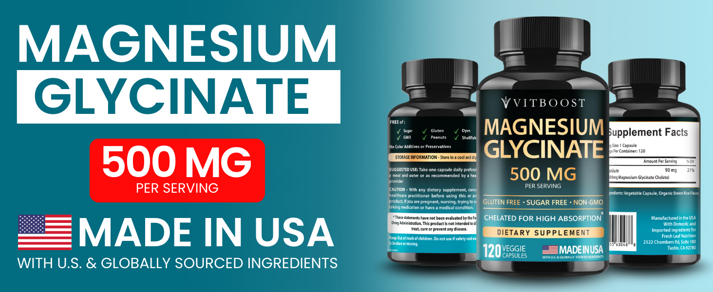 VITBOOST Magnesium Glycinate 500mg - مكمل مخلبي عالي الامتصاص - يدعم النوم وتعافي العضلات وصحة القلب - غير معدل وراثيًا، نباتي - 120 كبسولة - صنع في الولايات المتحدة الأمريكية