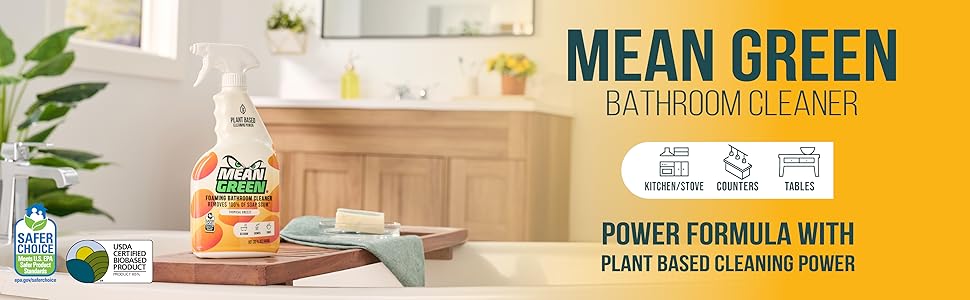 Turn your bathroom into a sparkling sanctuary with Mean Green Non-Concentrated Ready-to-Use Bathroom Cleaner – the plant-powered solution that conquers soap scum without harsh chemicals. Designed with the strength of minerals and plant-derived ingredients, this formula removes stubborn build-up while leaving behind a refreshing Tropical Breeze scent and zero residue. Key Benefits: Removes 100% of Soap Scum: Effortlessly cuts through bathroom build-up on tubs, showers, sinks, and tiles (based on ASTM D5343 on hard, non-porous surfaces after ~20 passes). Powerful Biodegradable Formula: Formulated with select plant-based surfactants, this Safer Choice-Certified cleaner delivers exceptional results while keeping your home safer. Tropical Breeze Fragrance: Bright, refreshing scent that makes every clean feel like a fresh escape. Bleach-Free & Residue-Free: No harsh bleach, no lingering film — just a sparkling, streak-free finish. Generous Size Bundle: THREE 32oz bottle comes ready-to-use — just spray and shine. Why Choose Mean Green Bathroom Cleaner? Every bathroom deserves a deep clean without the trade-offs. With its tough-on-soap-scum, gentle-on-home formula, Mean Green makes it simple to achieve a spotless, fresh bathroom that feels as good as it looks. Upgrade your bathroom clean with Mean Green Non-Concentrated Ready-to-Use Bathroom Cleaner – tough where it counts, gentle where it matters.