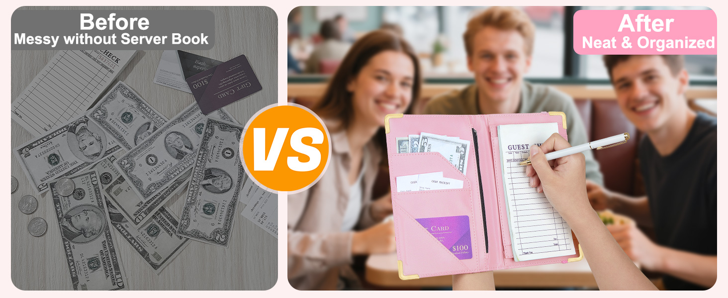 كتاب خادم متعدد الوظائف: تم تصميم كتاب التقديم للنادلات للحفاظ على كل شيء منظمًا مع مساحات مختلفة لتخزين العملات المعدنية والنقود والإيصالات والبطاقات وشيكات الضيوف أثناء نوبتك، مع حامل قلم لسهولة الوصول إليه. كما أنها بمثابة لوحة كتابة قوية لتلقي الطلبات.