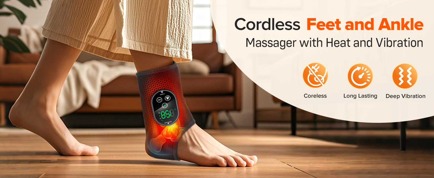 خذ تخفيف آلام قدمك في أي مكان. البطارية المدمجة بقدرة 3000 مللي أمبير في الساعة و3 مؤقتات للإغلاق التلقائي (20 أو 35 أو 45 دقيقة) تجعل جهاز تدليك الكاحل هذا لتخفيف الألم سهلًا وآمنًا للاستخدام على مكتبك أو على الأريكة أو أثناء السفر.