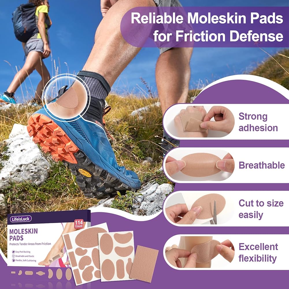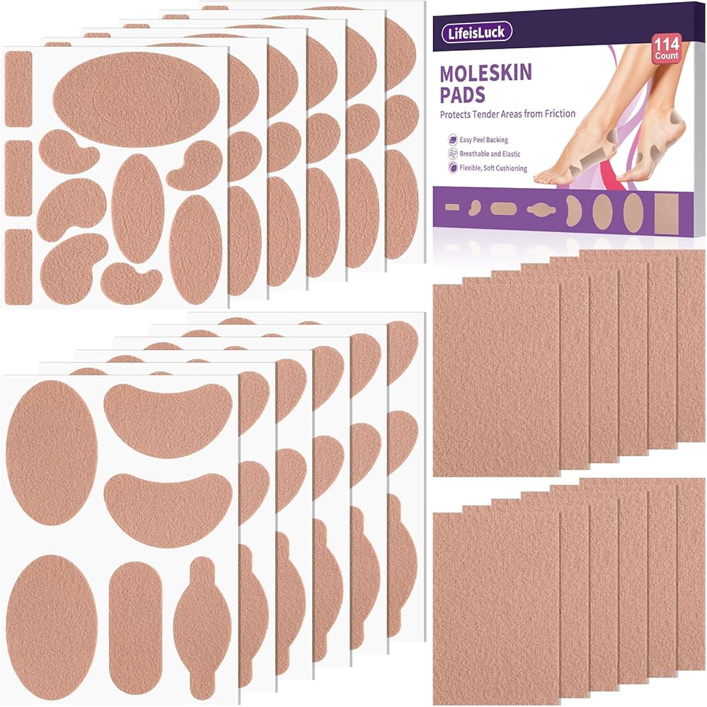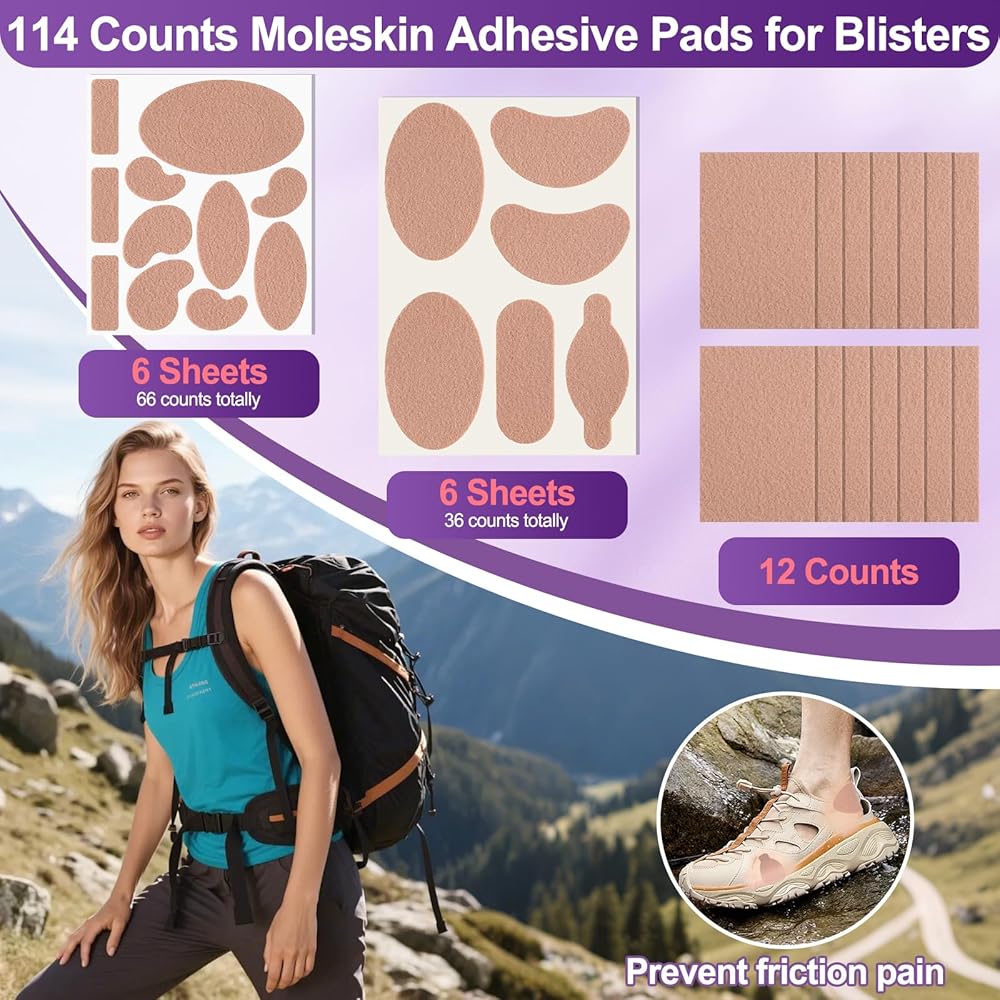 114 قطعة من وسادات منع الالتصاق للبثور للقدمين، 12 شكلًا من القطن الناعم ملصقات شريطية من الجلد الخلد شرائط مولسكين للقدمين وبطانة الكعب وأحذية المشي لمسافات طويلة تقلل من آلام الاحتكاك