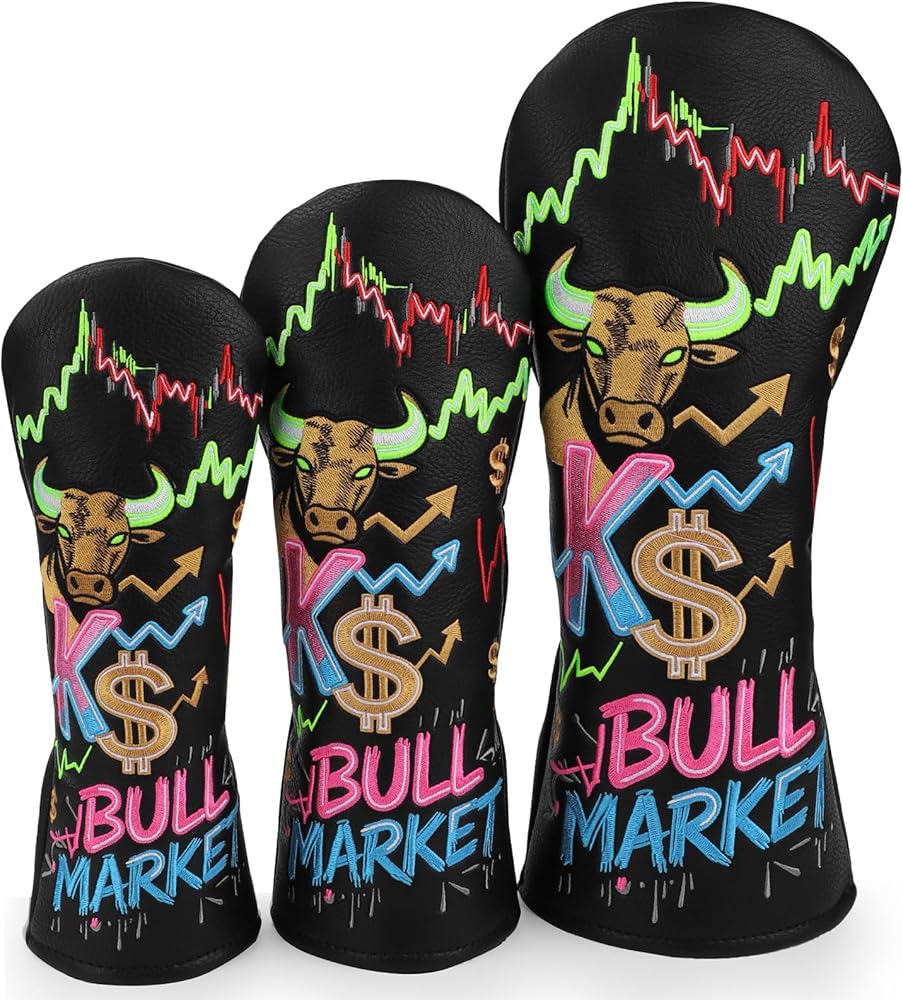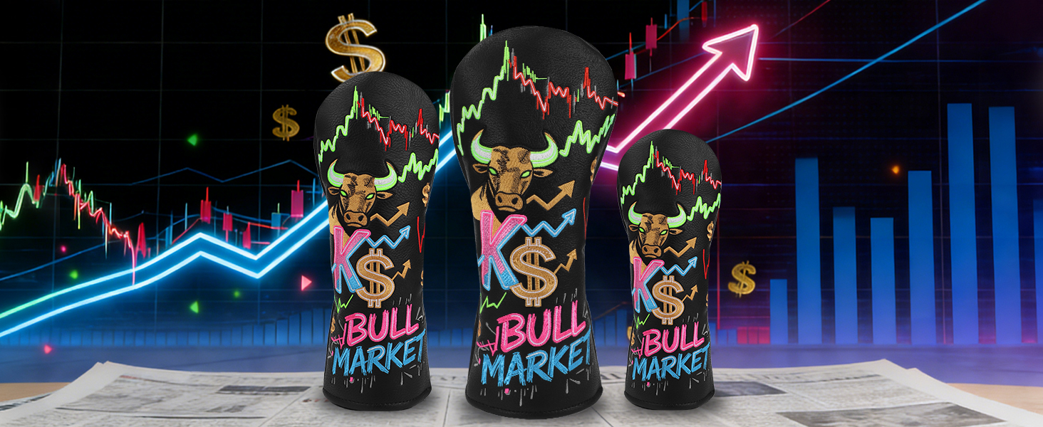 Hybrid Headcover – Universal Fit: This Hybrid headcover is designed for universal compatibility with all standard hybrids. Featuring a bold Bull Market design, it makes a powerful statement on the course while keeping your club protected and easy to spot in your bag.