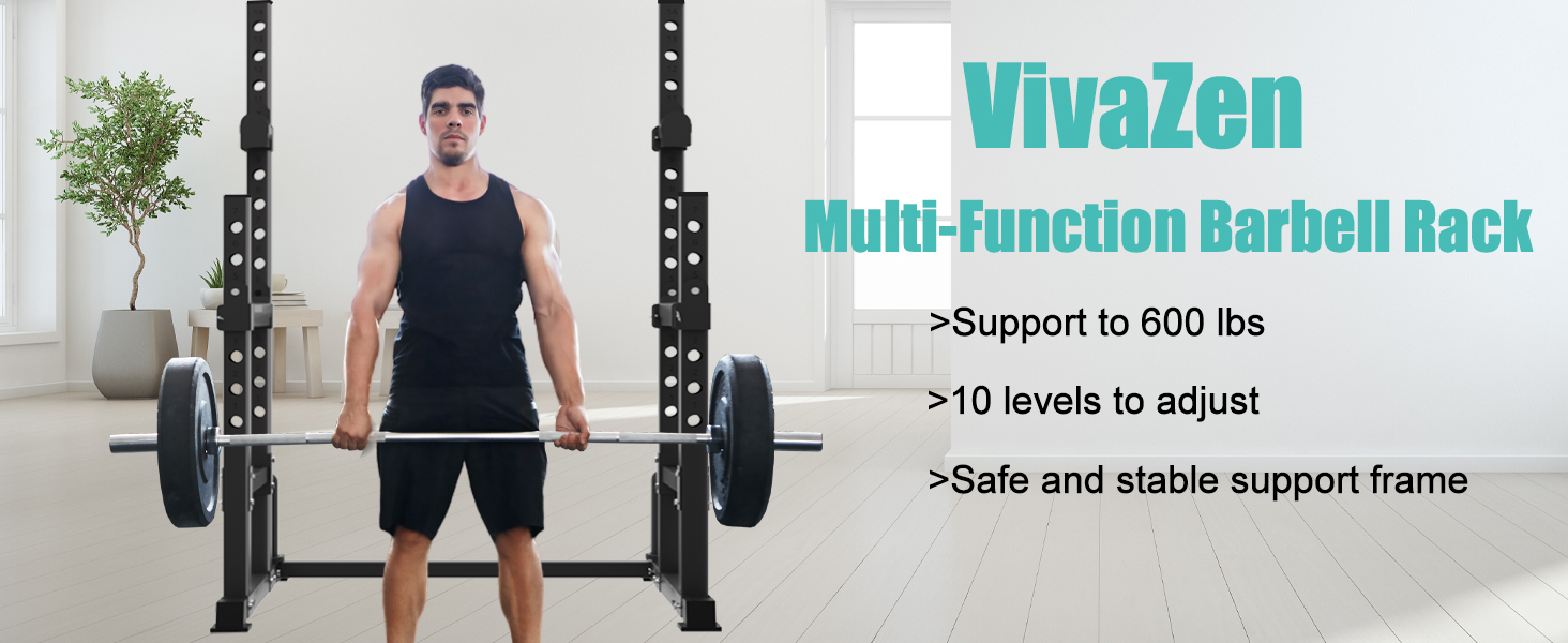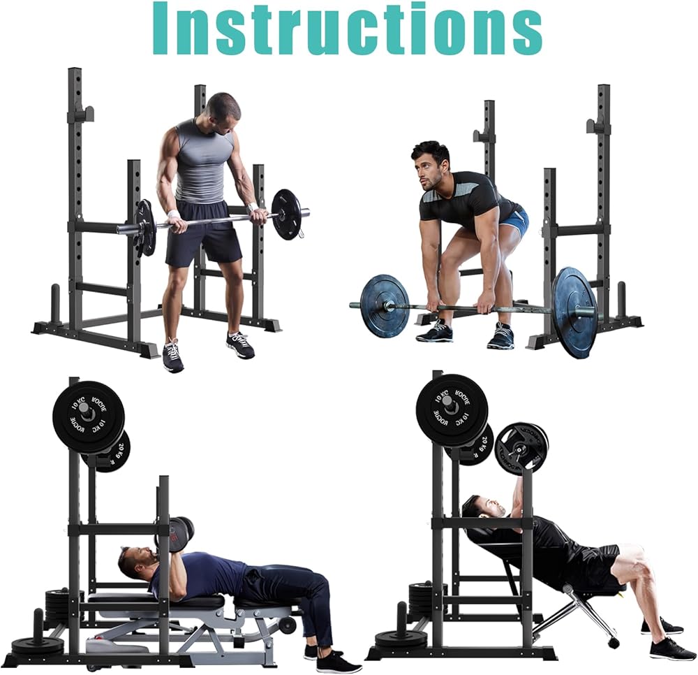 حامل القرفصاء القابل للتعديل ورف ضغط المقعد من VivZen - محطة رفع الأثقال متعددة الوظائف مع أذرع مراقبة وتخزين لوحة الوزن - معدات رياضية منزلية شديدة التحمل بوزن 600 رطل (ارتفاع 34 بوصة - 57 بوصة)