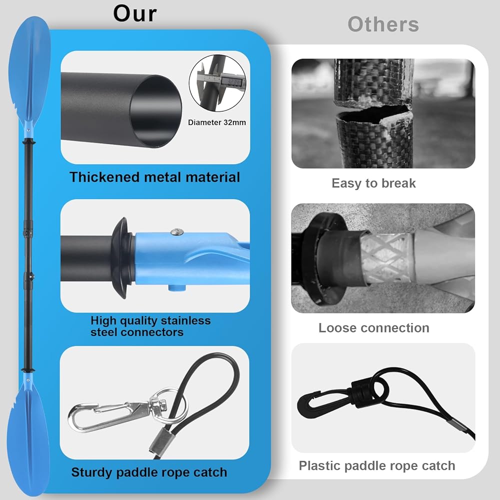 قوية ومتينة: مجاذيف الكاياك هذه مصنوعة من مادة عالية الجودة وشفرة مجداف صلبة من البولي بروبيلين، ليس من السهل الانحناء والكسر، فلا مزيد من القلق بشأن صلابتها ومتانتها أثناء الاستخدام. تعتبر مجاذيف الكاياك للبالغين مثالية لراكبي الكاياك المبتدئين والمتوسطين