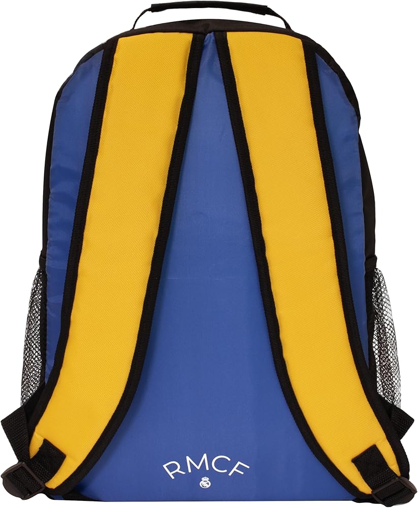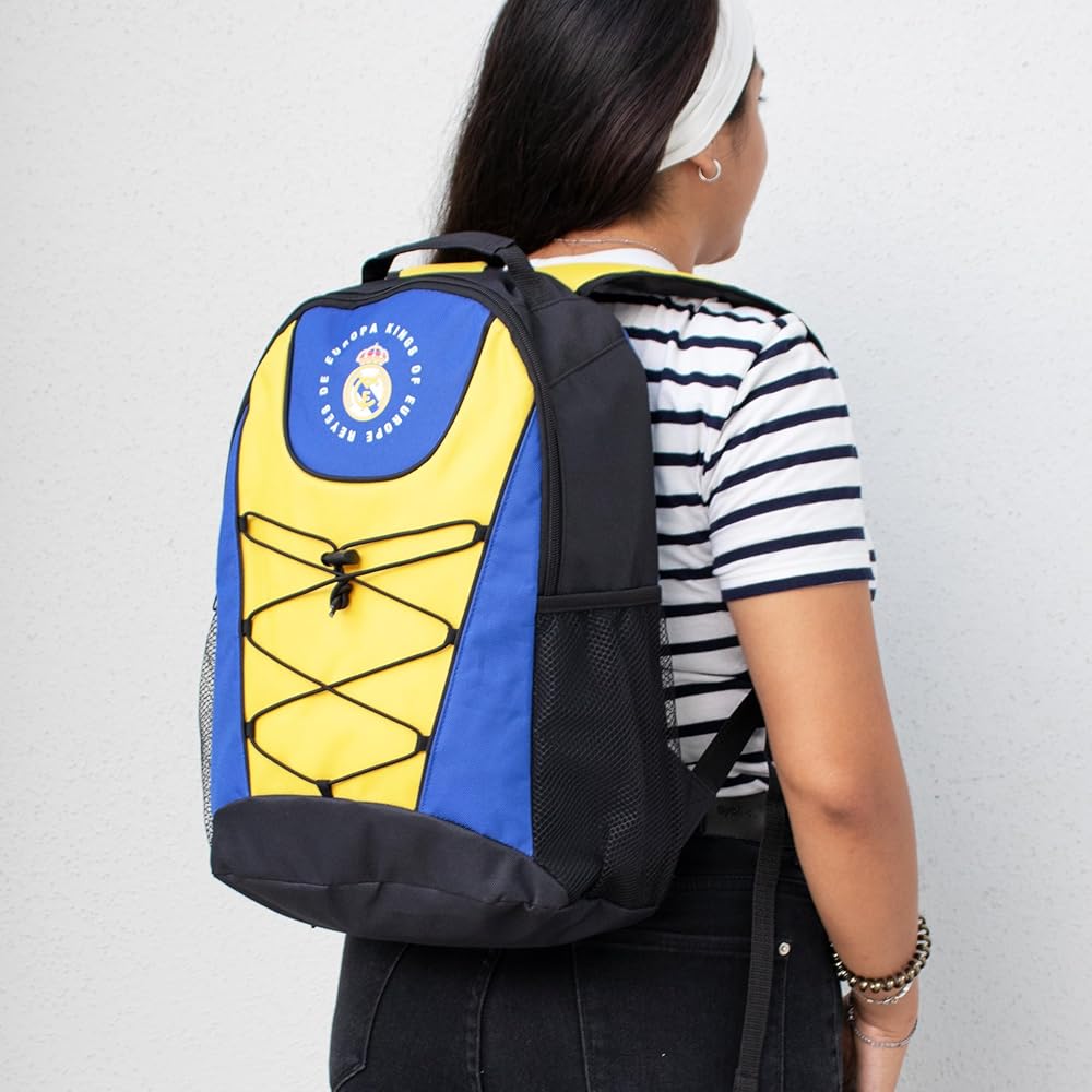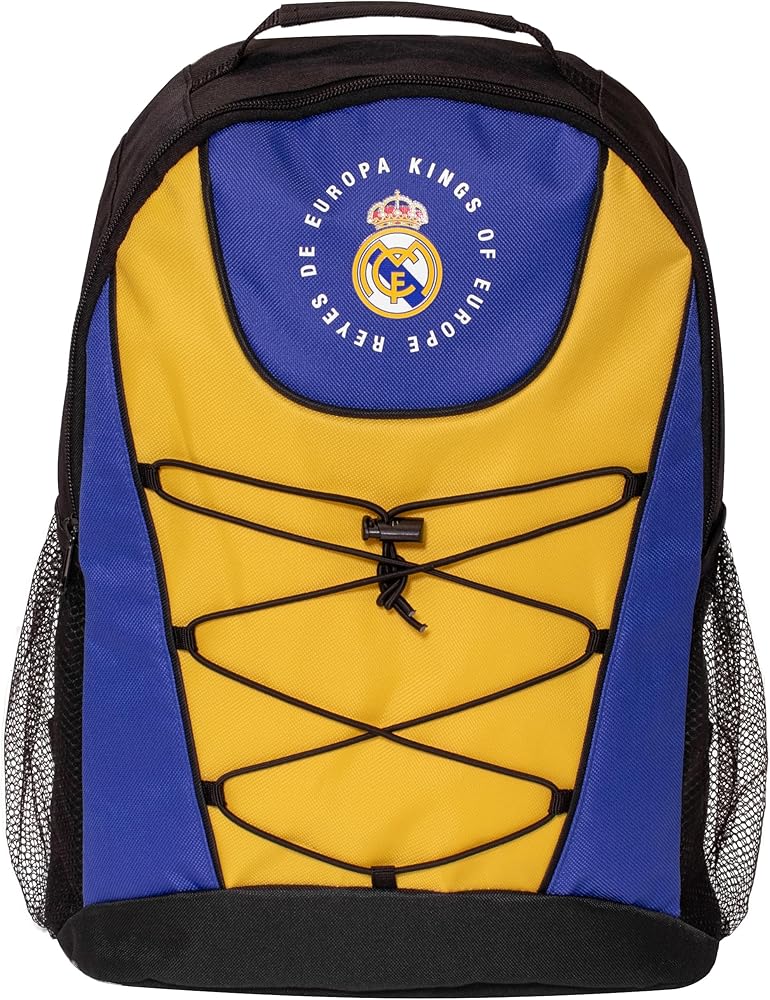 Real Madrid RMCF Bungee Backpack – Blue/Yellow Show your team pride wherever you go with the Real Madrid RMCF Bungee Backpack – the perfect companion for school, travel, or game day. Designed in striking blue and yellow team colors, this officially licensed Real Madrid backpack features the iconic club crest and “Kings of Europe – Reyes de Europa” printed proudly on the front. Spacious Storage: Large main compartment with zip closure provides ample space for books, gear, or daily essentials. Team Pride: Emblazoned with the Real Madrid CF crest and “RMCF” on the back, making it a must-have for any fan. Side Mesh Pockets: Dual mesh pockets for water bottles or quick-access items. Comfortable Fit: Padded, adjustable shoulder straps and breathable mesh backing for all-day comfort.