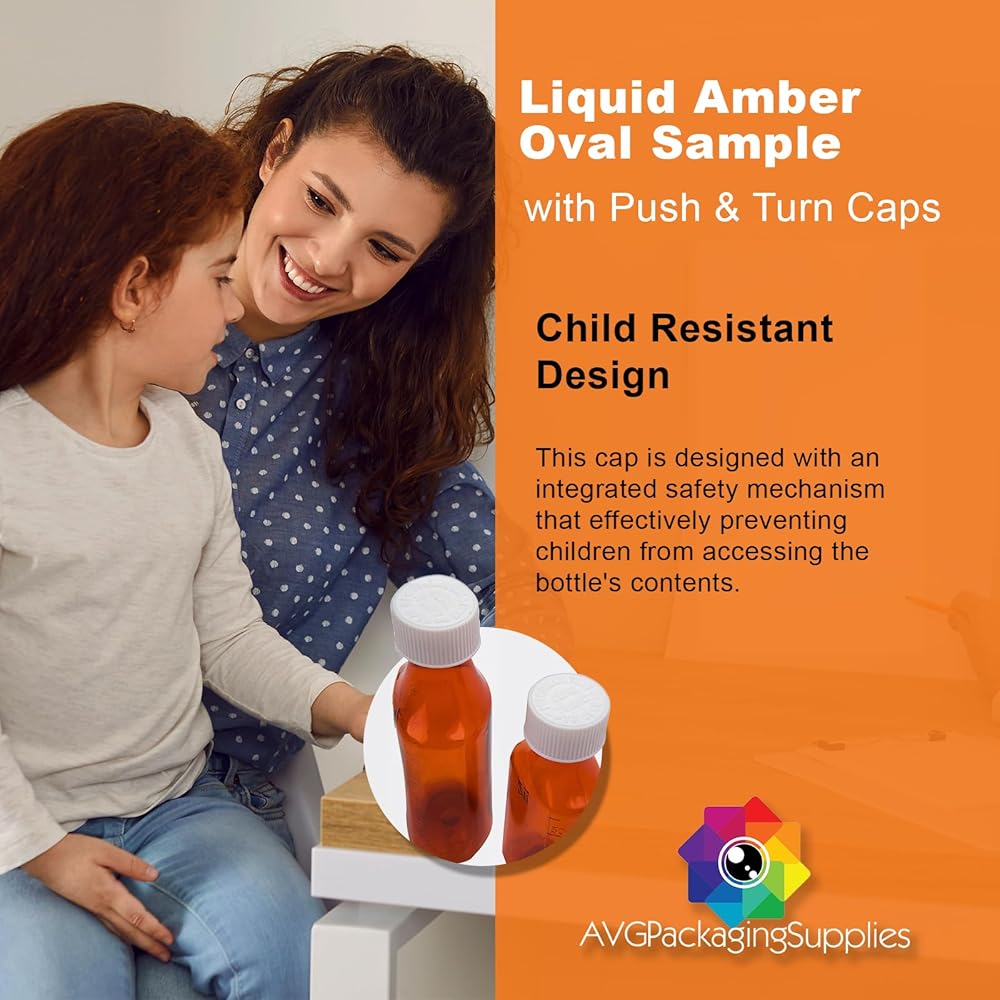 زجاجات عينة بيضاوية من العنبر السائل مع أغطية للدفع والدوران - حاويات أدوية طبية مقاومة للأطفال، قوارير سعة 8 أونصة (50 قيراط)