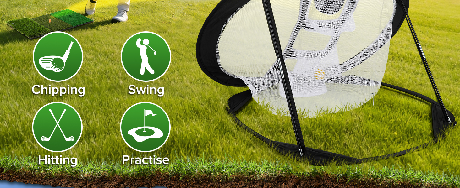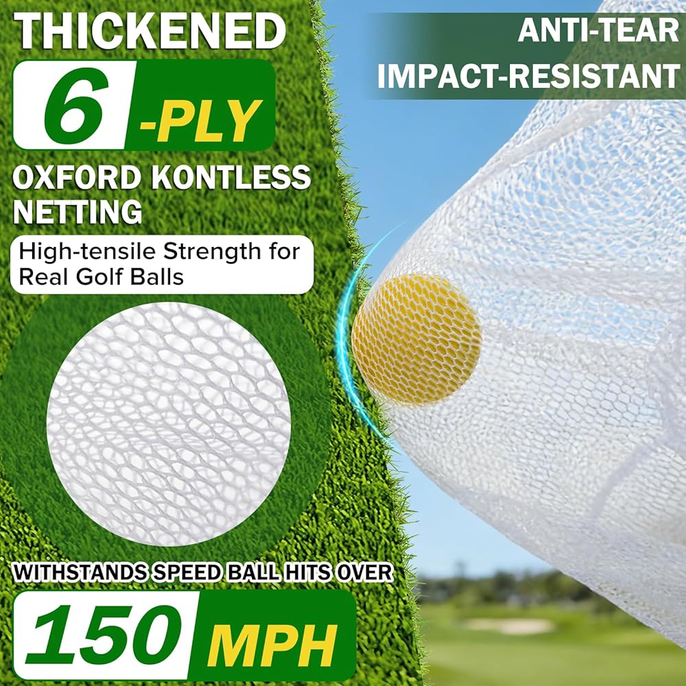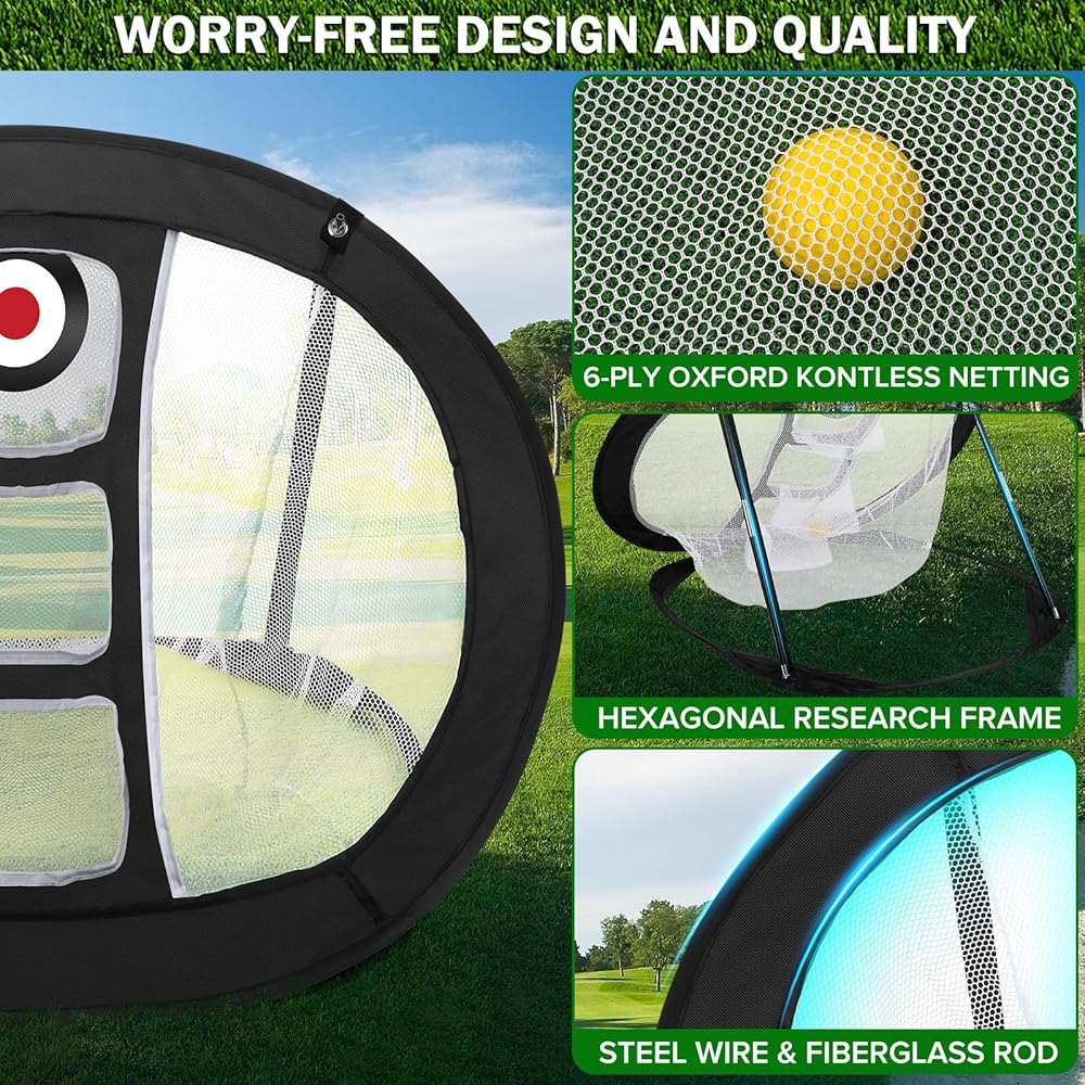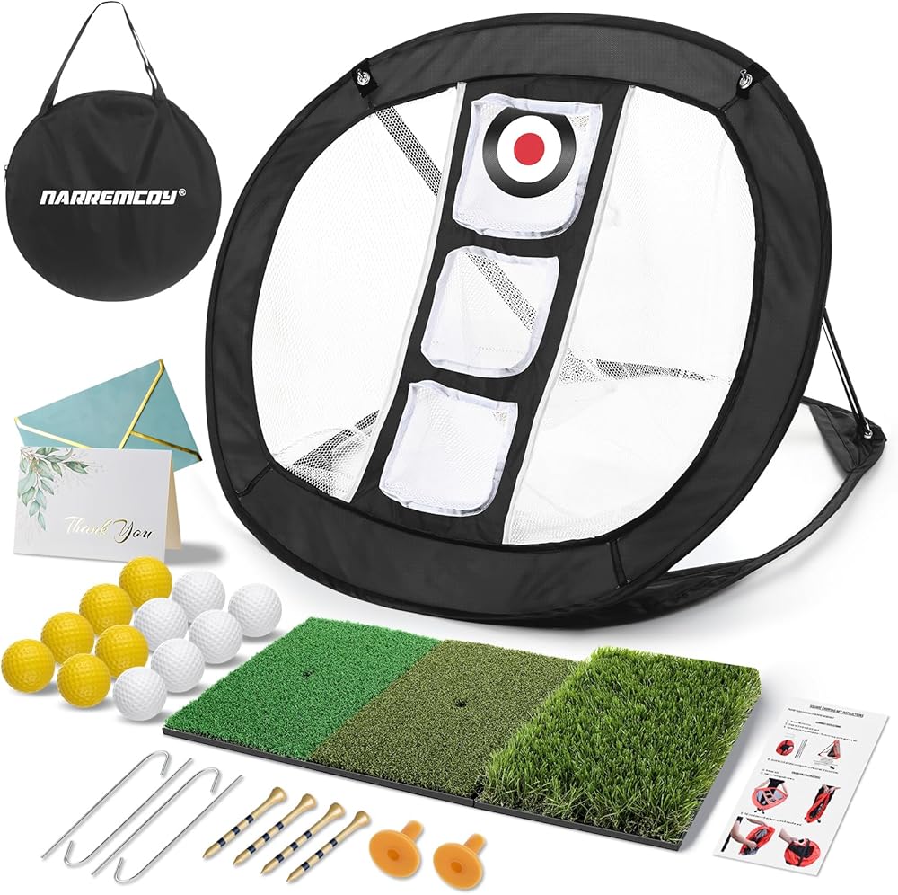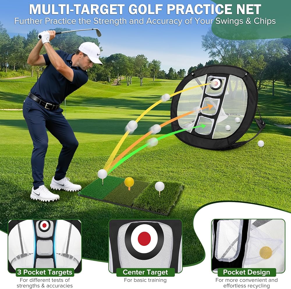 شبكة تقطيع الجولف مع مجموعة بساط ضرب ثلاثي العشب - هدف تدريب قابل للطي، 12 كرة إسفنجية و6 تي شيرت في حقيبة حمل - هدية تدريب دقيقة على الجولف في الأماكن المغلقة وفي الهواء الطلق في الفناء الخلفي ومساعدة للمبتدئين