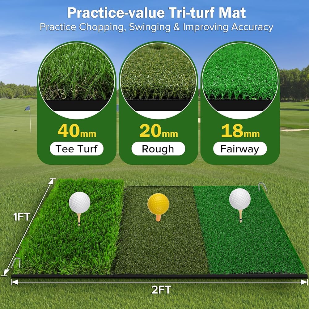 🌿[حصيرة تدريب ثلاثية العشب لإحساس حقيقي]: محاكاة ظروف عشب الجولف المختلفة مع سجادة الجولف ثلاثية العشب 3 في 1، التي تحاكي الممرات الخشنة والعشب المحملي. مصنوع من إسفنج EVA لتحقيق الثبات أثناء جلسات التدريب المكثفة - رائع للأيام الممطرة أو التدريب الداخلي في الشتاء.