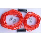 A set of easy to adjust pull-up style double leg 1/4-inch hollow braid rope guy lines. Use with your set of poles and nail stakes. The set includes two 1/4-inch x 28-ft rope lengths, four solid PVC slide bars 4-7/8 x 3/4-inch and four double zinc plated steel chain loops. The four chain loops allow for quick attachment of your 3/8-inch diameter landscaping spike not included. You will need to assemble and form the size of rope loop to go over the top of your pole.