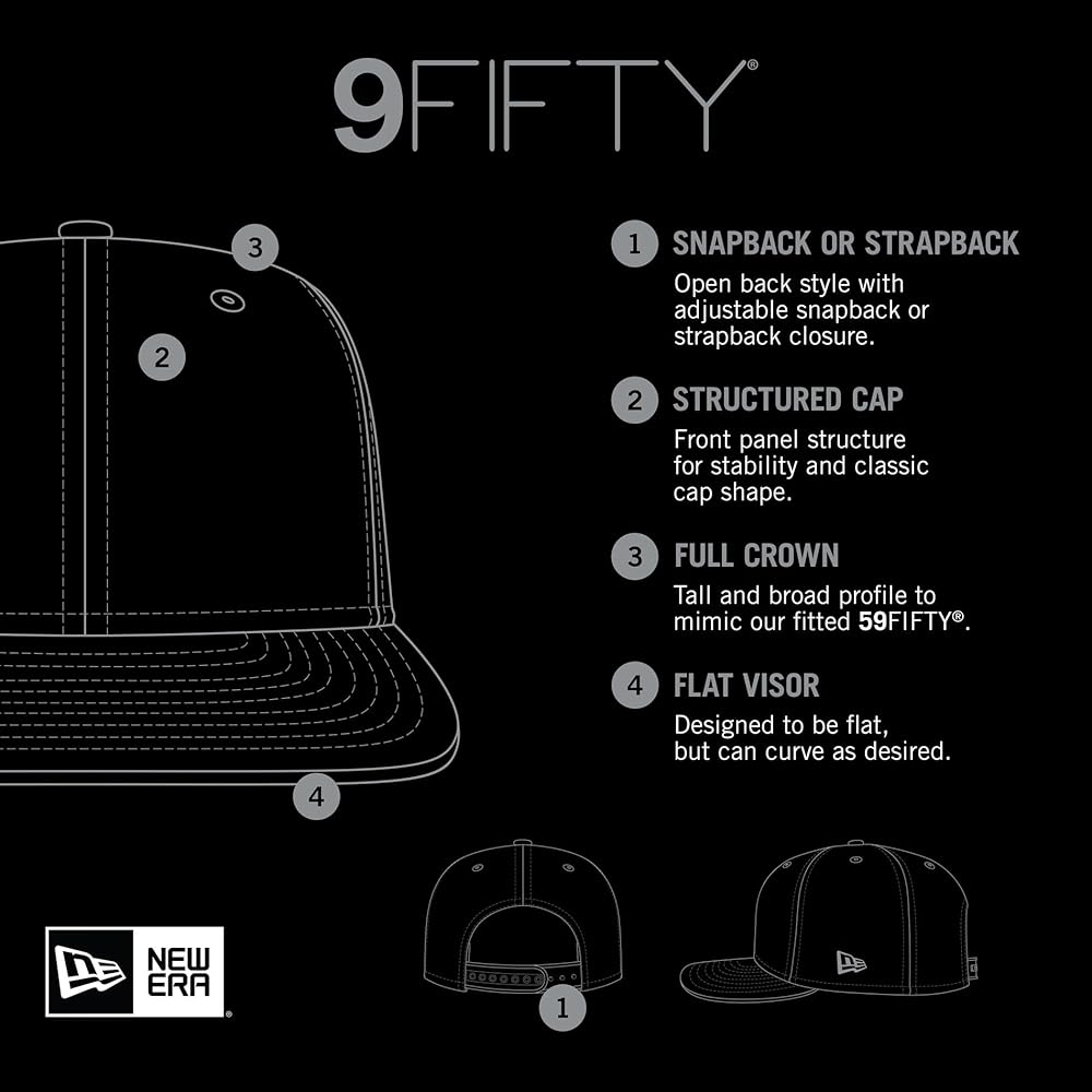CLASSIC 9FIFTY DESIGN: Offers a structured fit with a high crown and flat bill, embodying New Era's classic snapback style. 100% Polyester material.