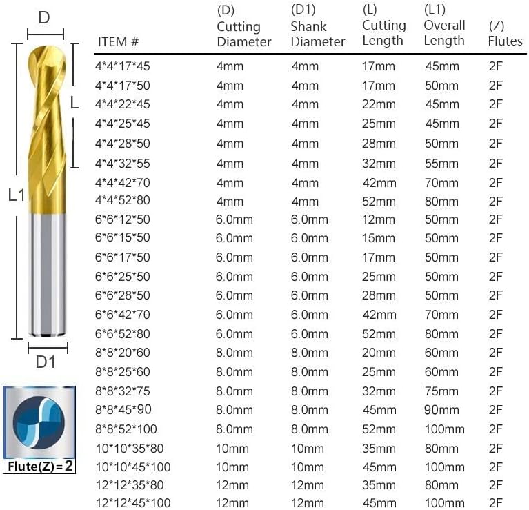 • قطع نهاية الكرة بتصميم 2-فلوت تصميم مساحة رقاقة حلزونية لإزالة الرقائق بسرعة ونظيفة. حافة القطع الحادة توفر قطعًا سلسًا.