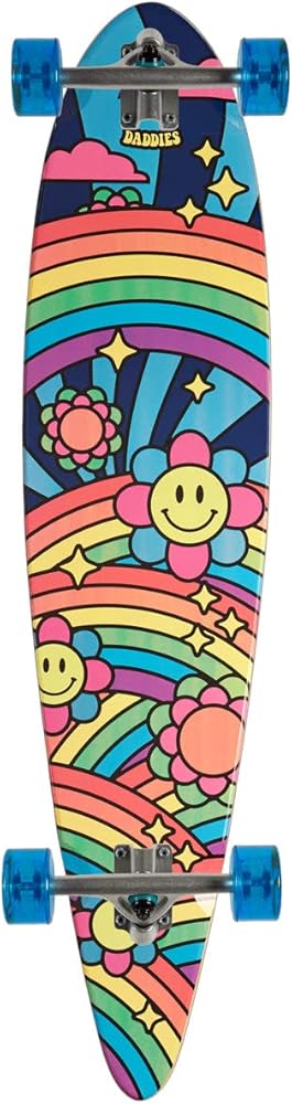 Turn on. Tune out. Drop in. Pintail Longboard shapes, by design, are some of the most comfortable and easiest longboards to maneuver (and theyre the best to learn on). The Daddies Trip On Pintail Longboard is a surf-inspired shape that make the journey a soul-assuring adventure in carve and flow. And with a psychedelic graphic, this longboard will have you smiling even when youre not riding it. Length - 38" Width 9.5" Wheelbase 26" Sanded wheel wells A great value!