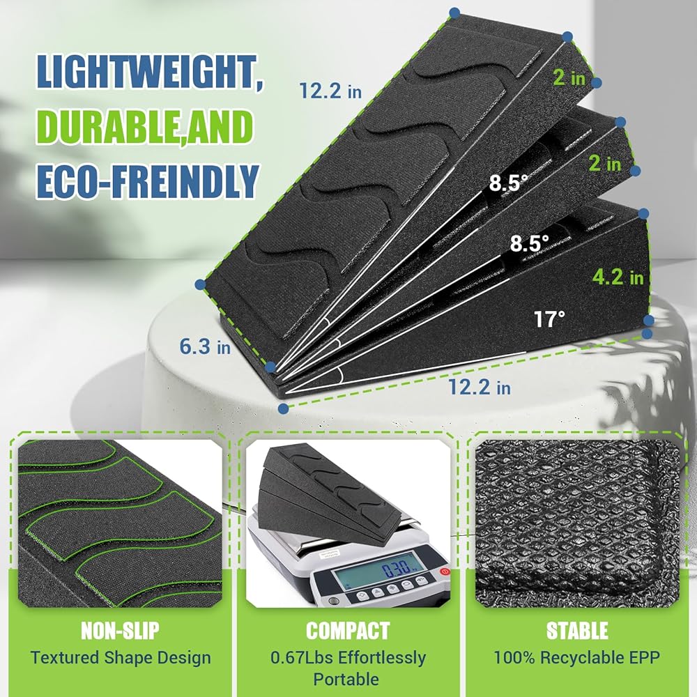 مجموعة ألواح مائلة حاصلة على براءة اختراع وخدمة ما بعد البيع لمدة عام: إسفين مطاطي من ربلة الساق حاصل على براءة اختراع. تشتمل مجموعة إسفين القرفصاء الكاملة على 3 كتل إسفينية وملصق تدريب توضيحي مع تمارين موجهة. حجم لوحين مائلين بزاوية 8.5 درجة هو (12''L*6.5''W*2''H)، وحجم لوح واحد مائل بزاوية 17° هو (12''L*6.5''W*4'' H). إذا فشل إسفين قدمك في ظل الاستخدام العادي، فسوف نستبدله على الفور - مما يضمن أن هذا هو آخر لوح مائل ستحتاج إلى شرائه على الإطلاق.